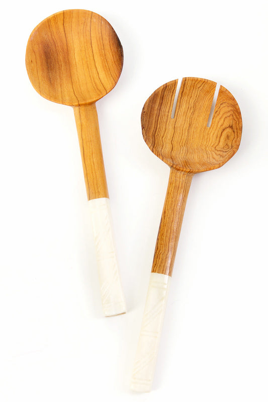 Kenyan Olive Wood Simple Salad Servers with Batik Bone Handles
