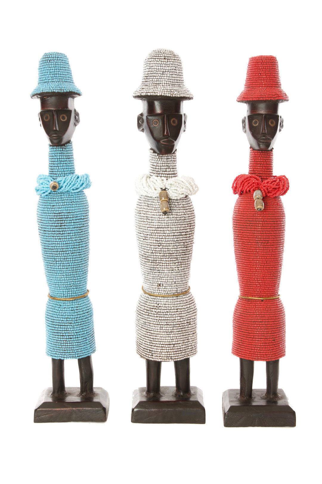 Traditionally, Namji dolls were crafted by artisans in northern Cameroon to serve as fertility dolls. Carried by young girls to encourage mothering instincts and by women hoping to conceive, Namji dolls consisted of a wooden figure surrounded in beads. Our modern interpretations of Namji dolls are crafted by artisans from Cameroon and the Democratic Republic of Congo who are currently living as refugees in Nairobi, Kenya. Their love for this traditional fertility doll have given them a loyal following in shops throughout East Africa.