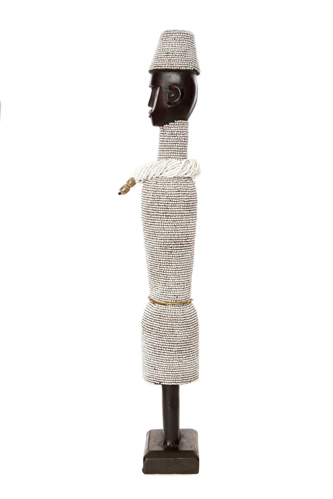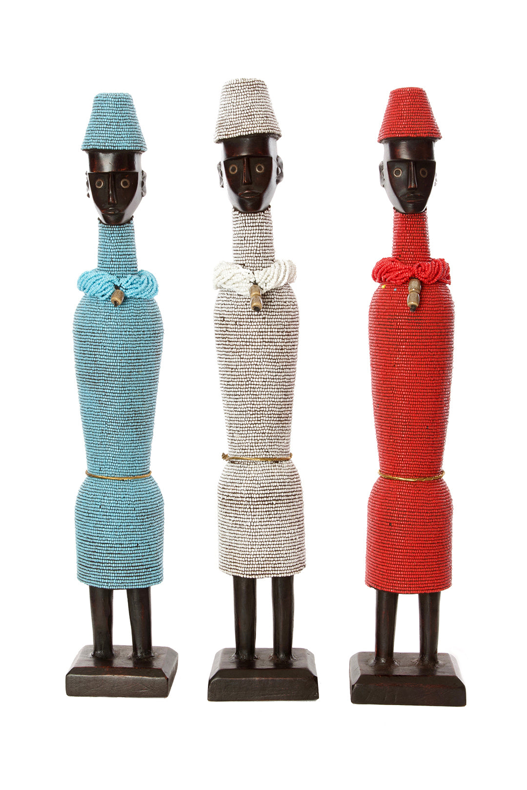 Traditionally, Namji dolls were crafted by artisans in northern Cameroon to serve as fertility dolls. Carried by young girls to encourage mothering instincts and by women hoping to conceive, Namji dolls consisted of a wooden figure surrounded in beads. Our modern interpretations of Namji dolls are crafted by artisans from Cameroon and the Democratic Republic of Congo who are currently living as refugees in Nairobi, Kenya. Their love for this traditional fertility doll have given them a loyal following in shops throughout East Africa.