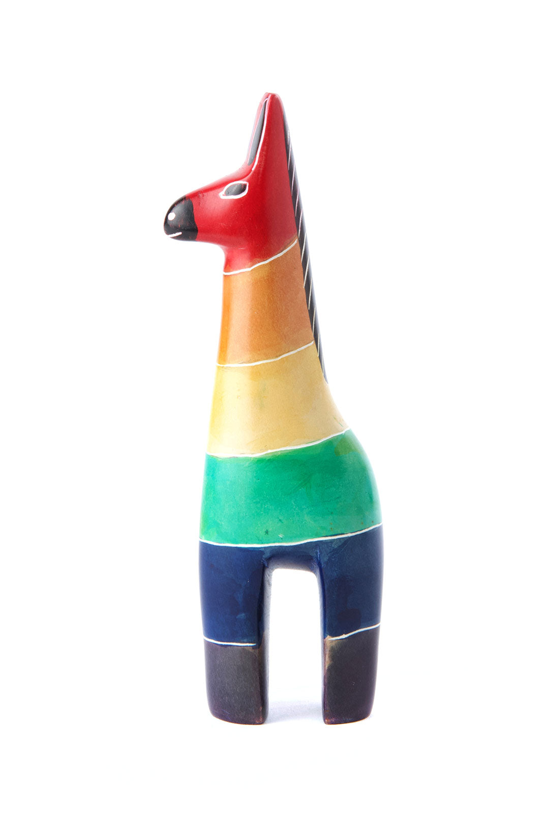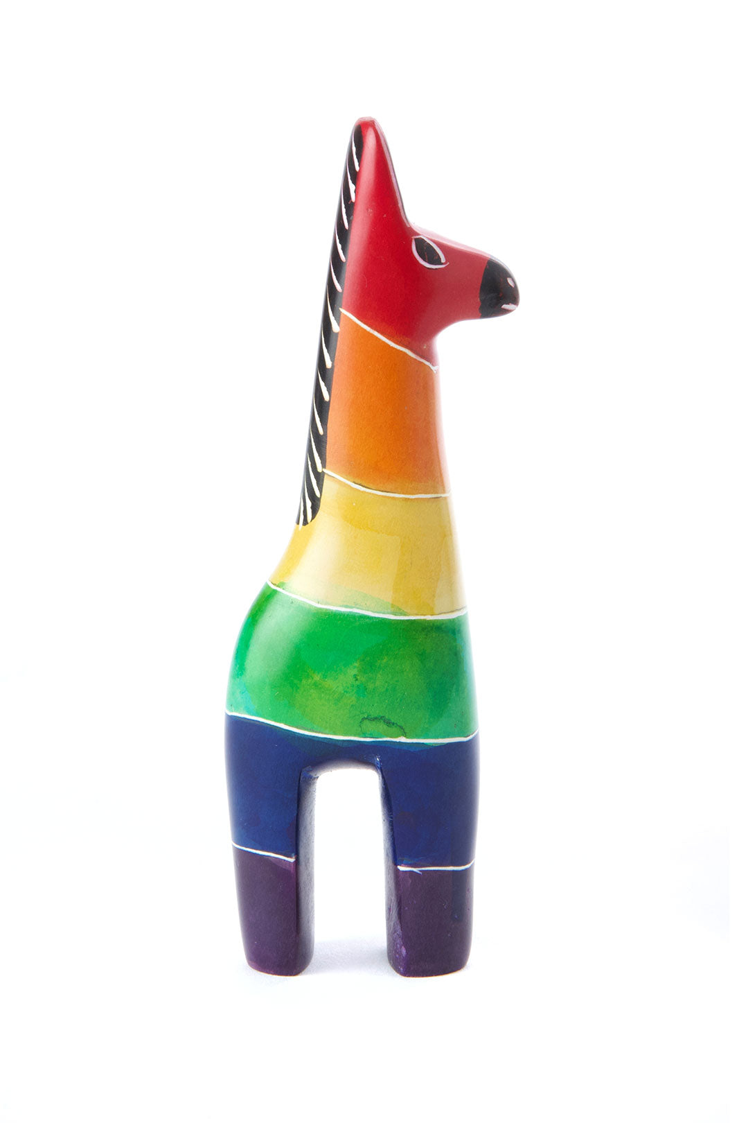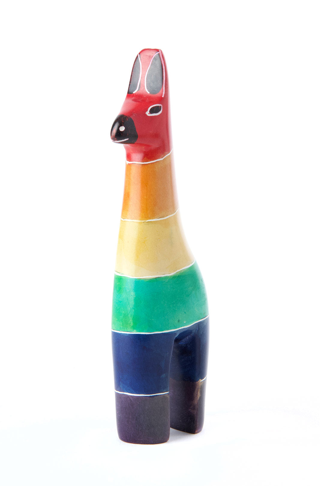 Kenyan artisans create a vibrant rendition of a giraffe in soft soapstone, dyed in brilliant hues of red, orange, yellow, green, blue and purple.