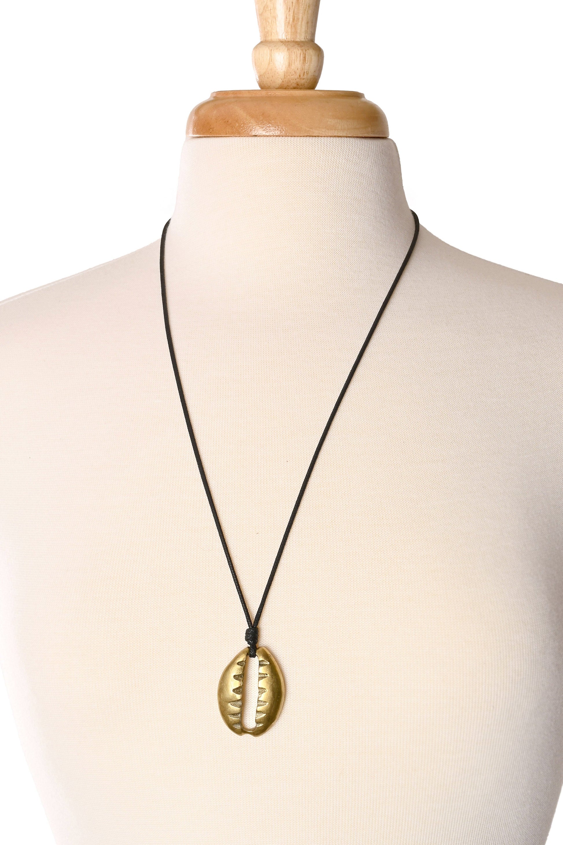 Kenyan artisans shape warm brass into a stylized cowrie shell pendant. It hangs from a knotted, adjustable cord for easy, versatile wear, whether you prefer it close to the collar or hanging longer as a statement piece.