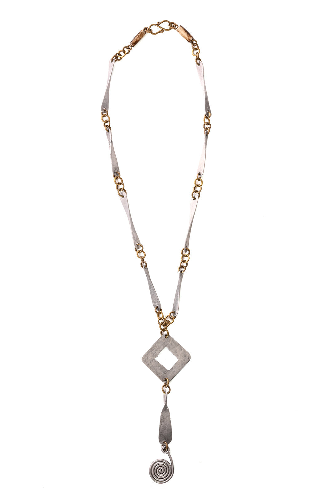 Artisans in Kenya hand-forge lightweight aluminum into textured links, fastened with contrasting brass rings and a sturdy brass clasp. A diamond-shaped aluminum pendant anchors the piece, with a traditional spiral charm suspended from an aluminum link at its base, finished with two oblong batiked bone beads at the clasp. Lightweight and easy to wear, this necklace offers a modern take on timeless forms.