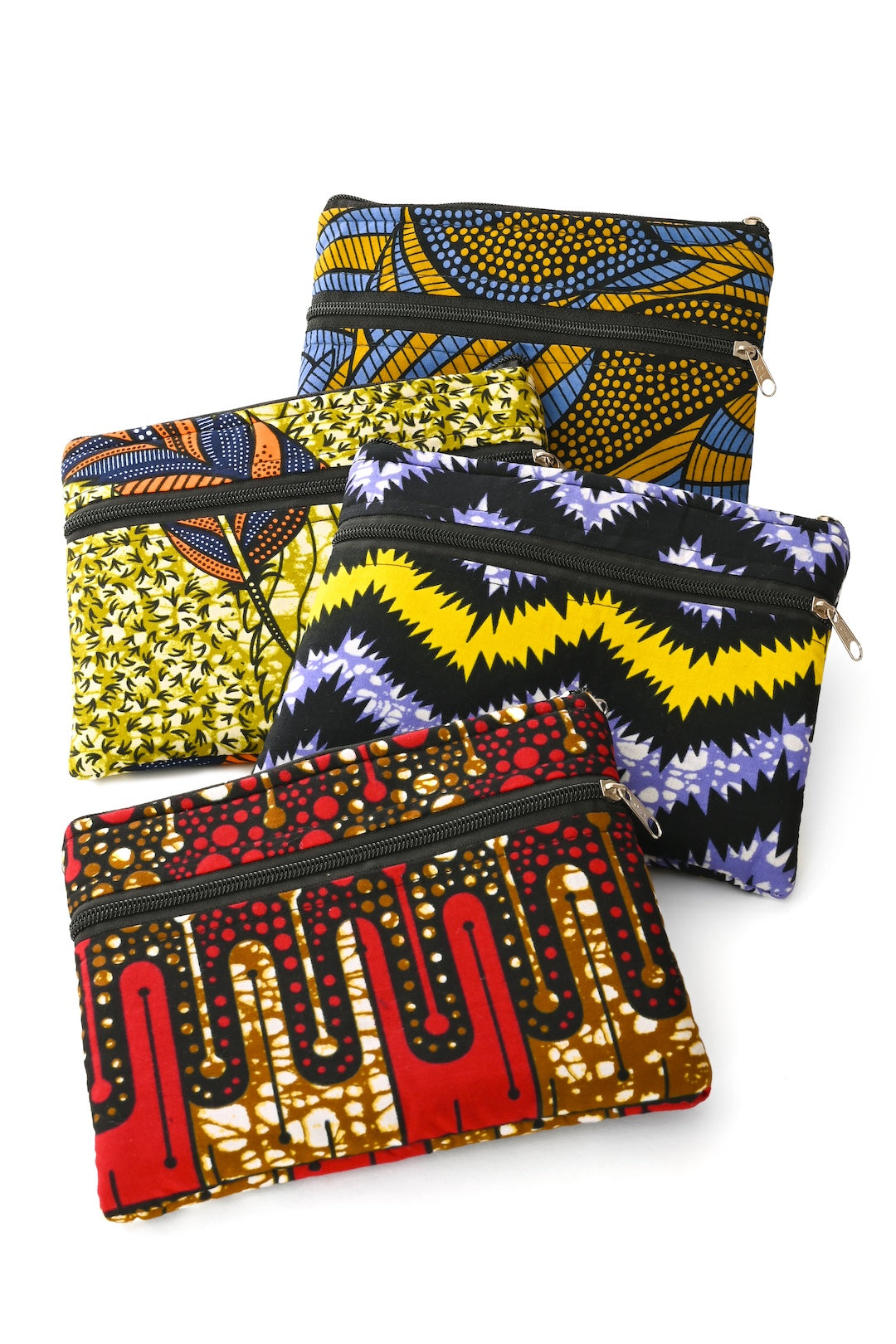 Kenyan artisans sew these useful zippered clutches from assorted cuts of colorful printed cotton wax cloth. Each clutch is completely unique, and includes a main zippered compartment and a zippered outside compartment.