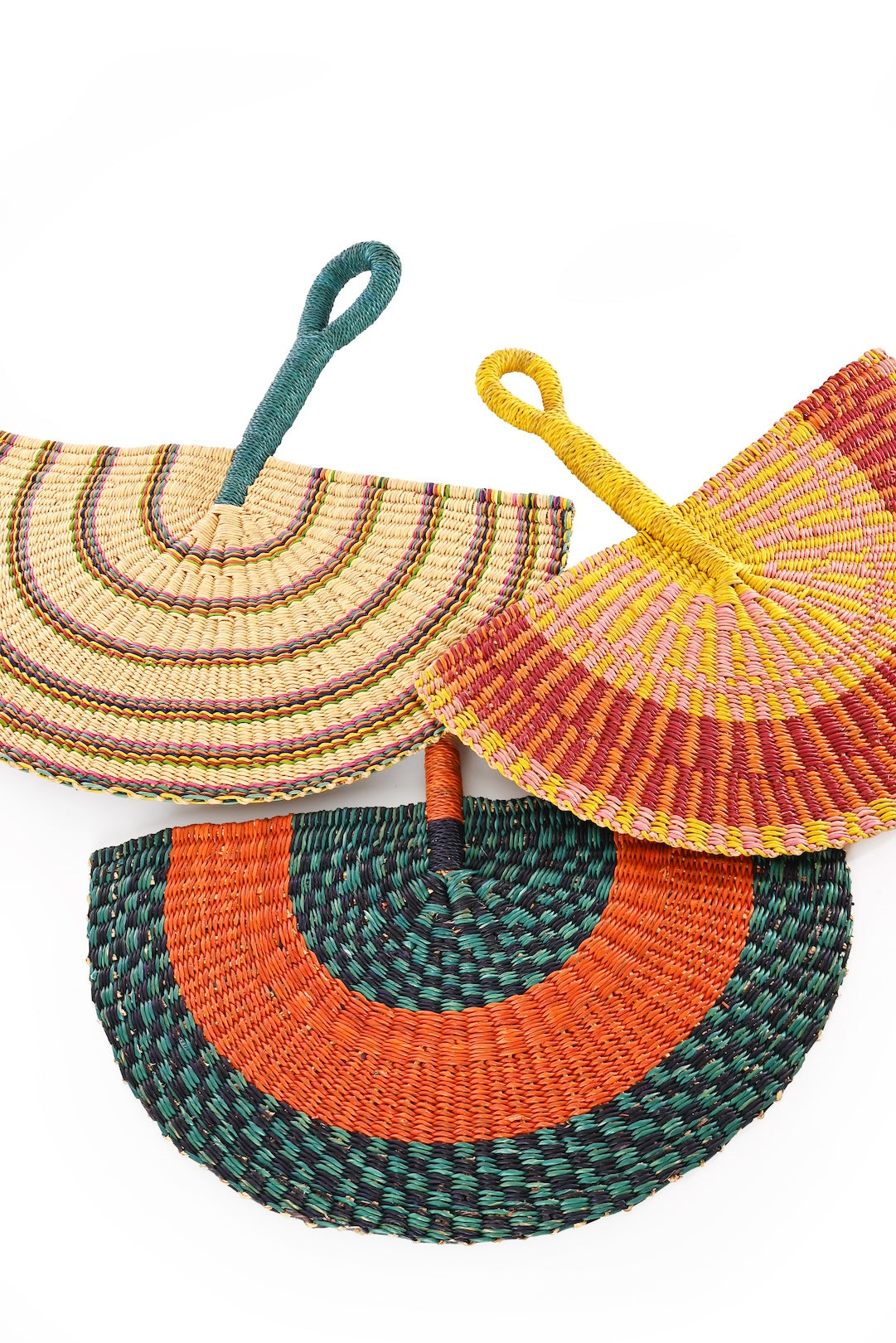Talented weavers in Ghana's northern Bolgatanga region craft beautiful half-moon shaped hand fans from natural and dyed elephant grass. The fan doubles as wall art when not in use.