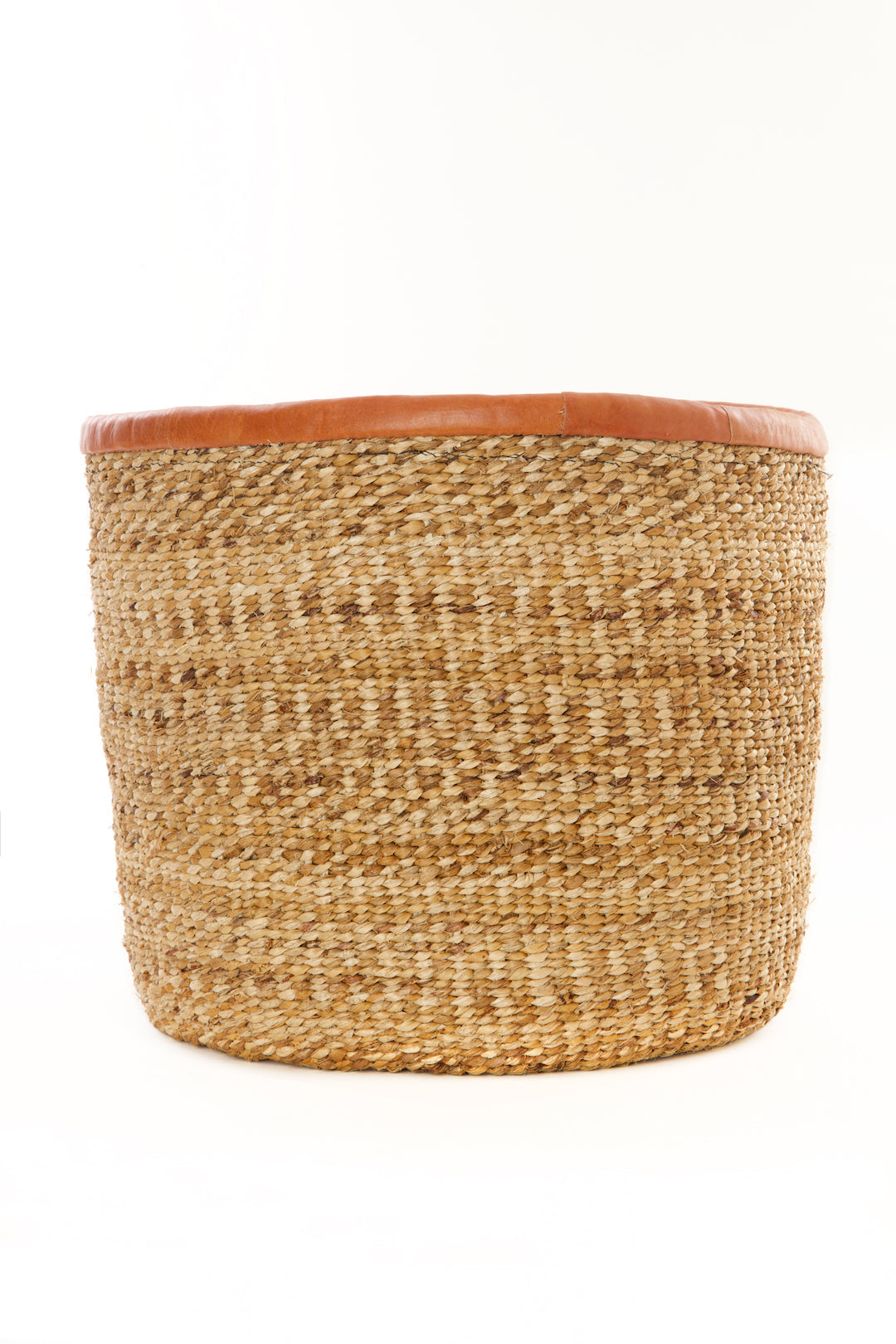 In the hands of skilled weavers, natural fibers like banana leaf can be transformed into useful objects for the home. This classic banana fiber bin is capped beautifully with soft leather.