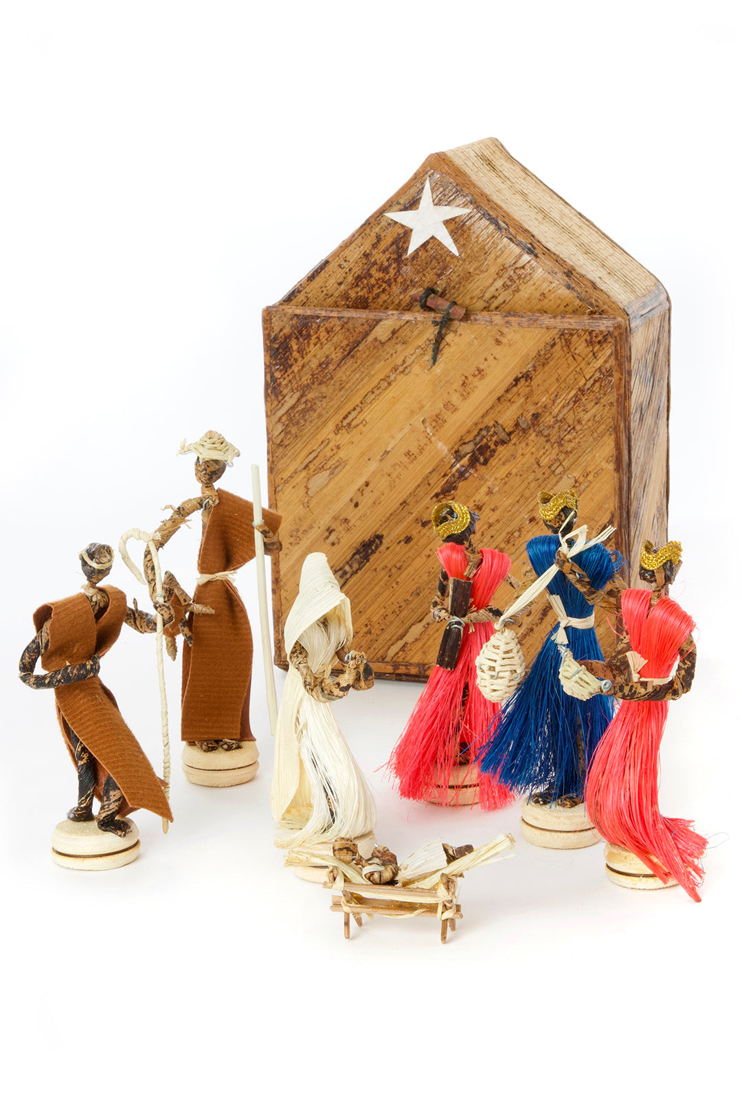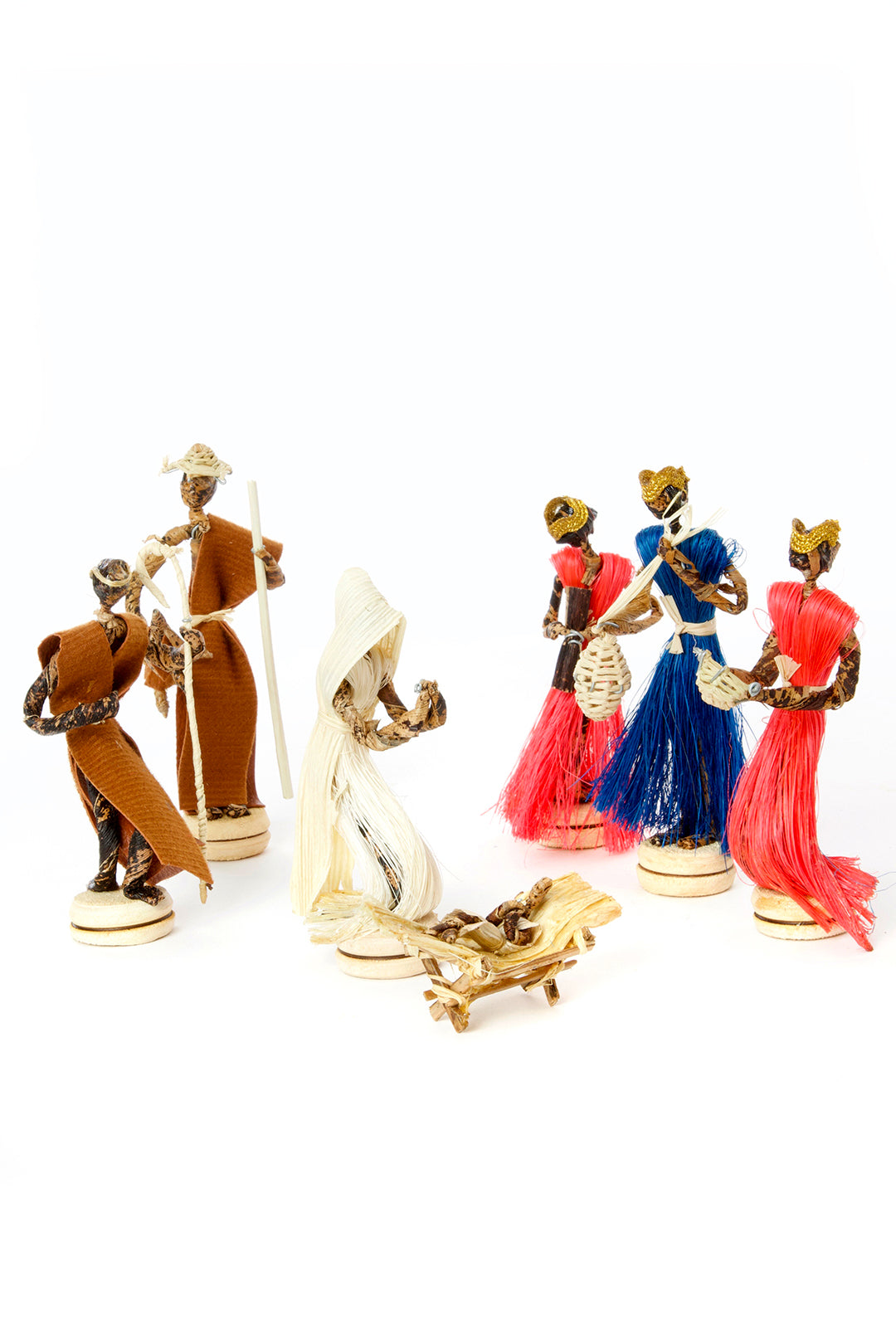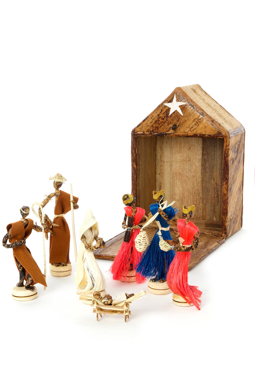 Kenyan artisans utilize abundant banana palm leaf fiber to create unique collectibles. This sweet nativity scene is handcrafted from banana fiber, wire, corn husk and wood. Featuring Mary, Joseph, the infant Christ, three kings, a shepherd and an animal, the scene fits nicely into its single door stable.