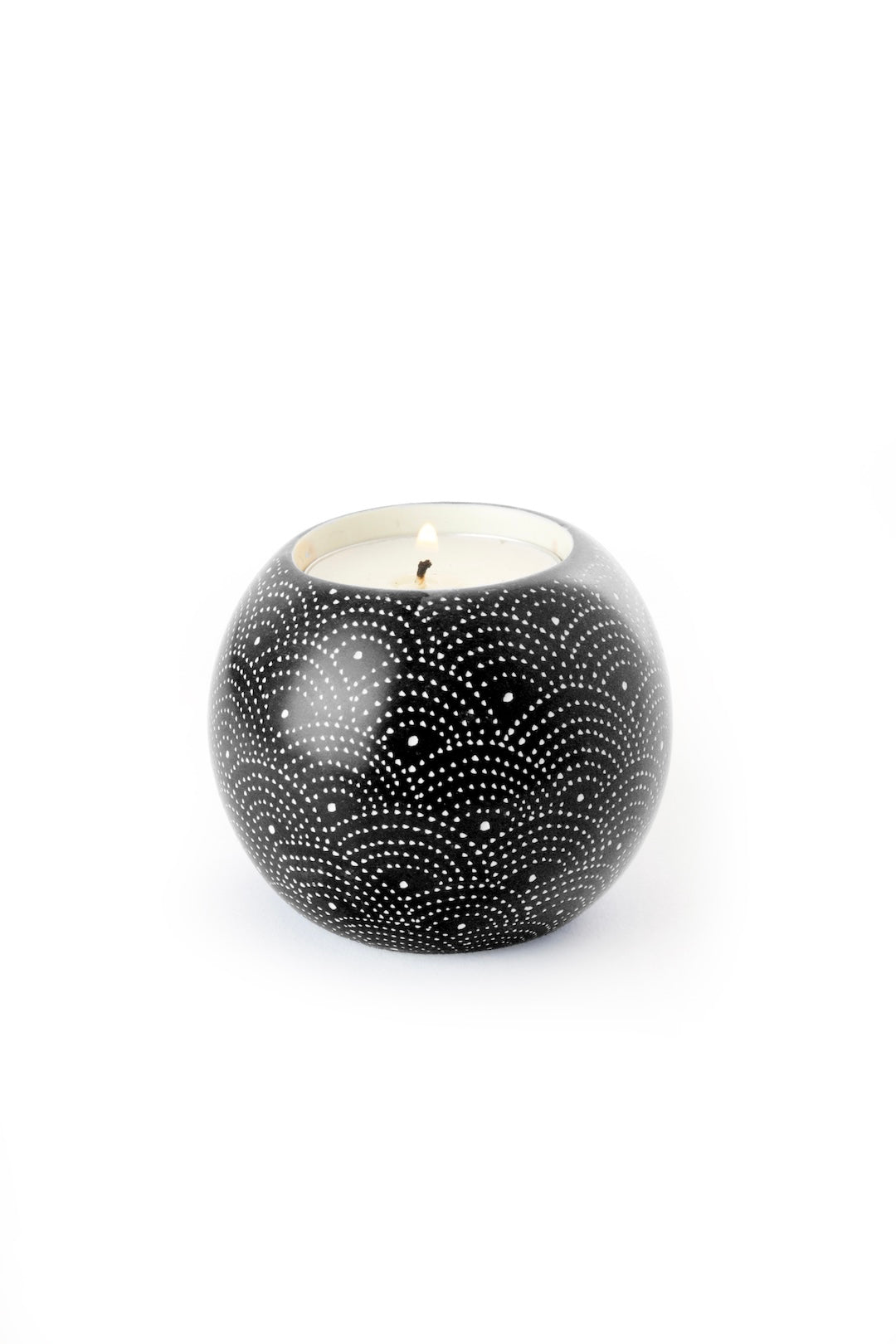 Carvers in Kenya's western highlands craft the basic form for a sphere tea light candle holder from soft soapstone. Artisans in a Nairobi workshop then add a rich black dyed finish and art deco inspired etched details.