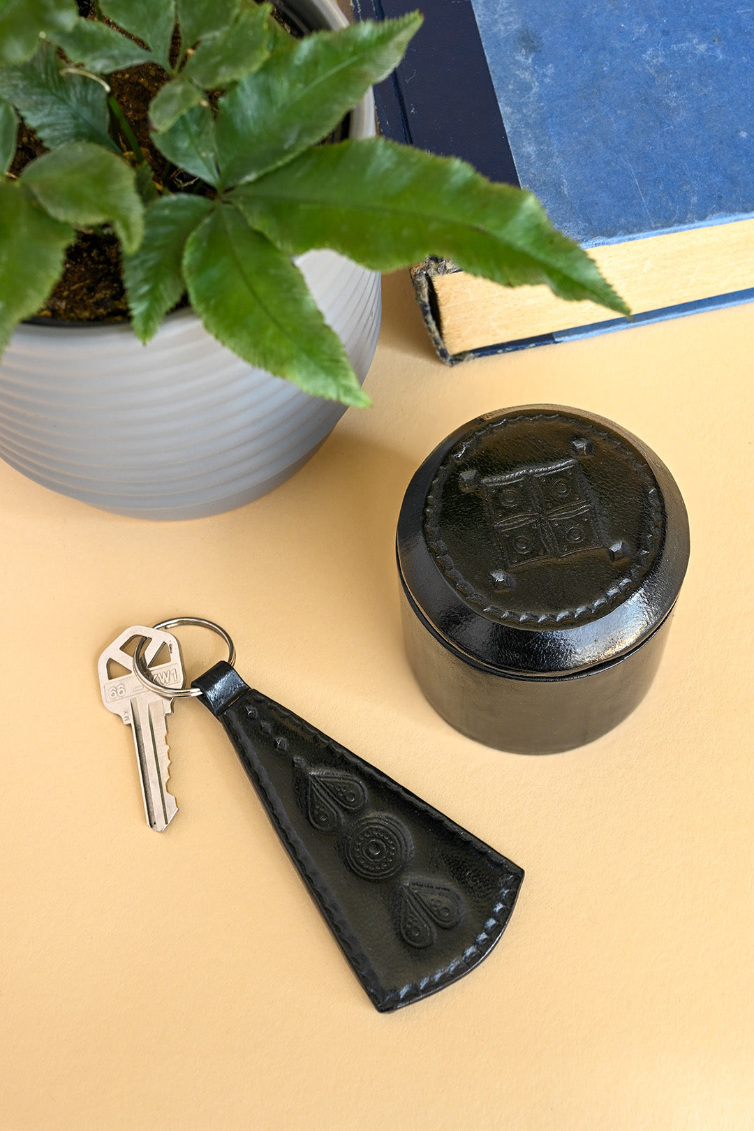 For stashing your treasures or enclosing the most special small gifts, this classic black leather box is made to keep and to cherish. The top of the box is hand-stamped with an intricate design of diamonds. Each one is handmade by skilled Tuareg artisans in Burkina Faso.