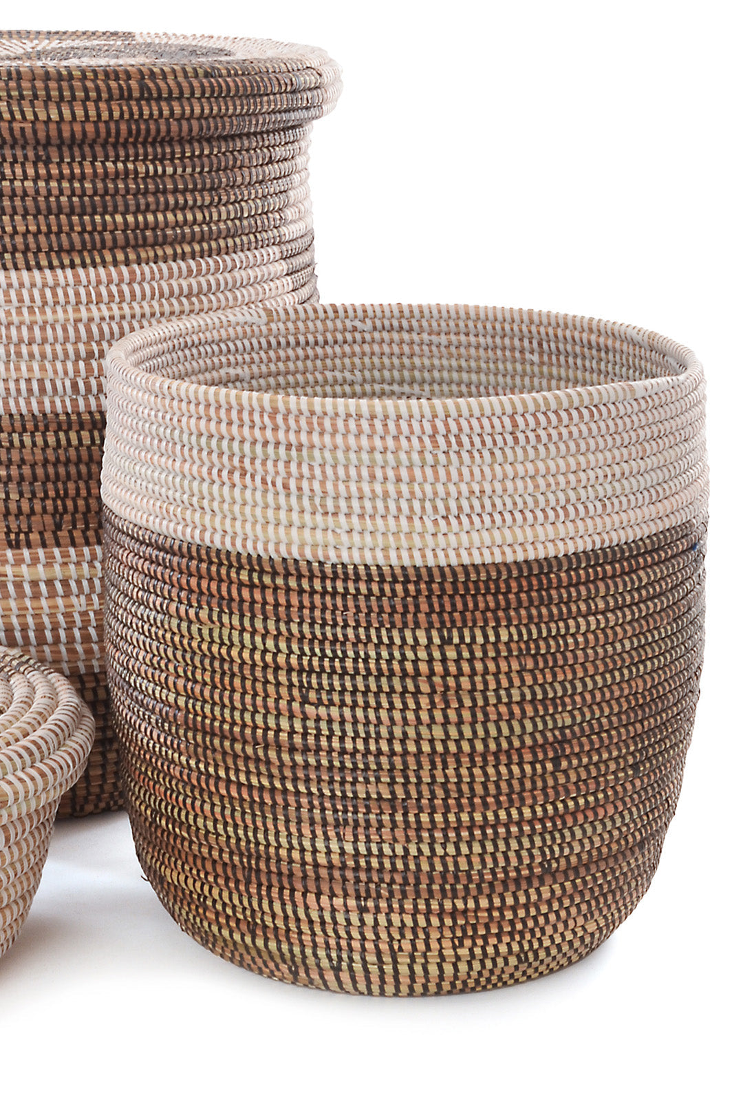 Wolof women in the West African nation of Senegal update traditional coil weaving methods by enlivening natural grass baskets with strips of plastic salvaged from a mat factory. Cattails grow abundantly in rural Senegal, so women can earn a sustainable income from basket weaving, while enriching homes around the world with modern African craftsmanship.