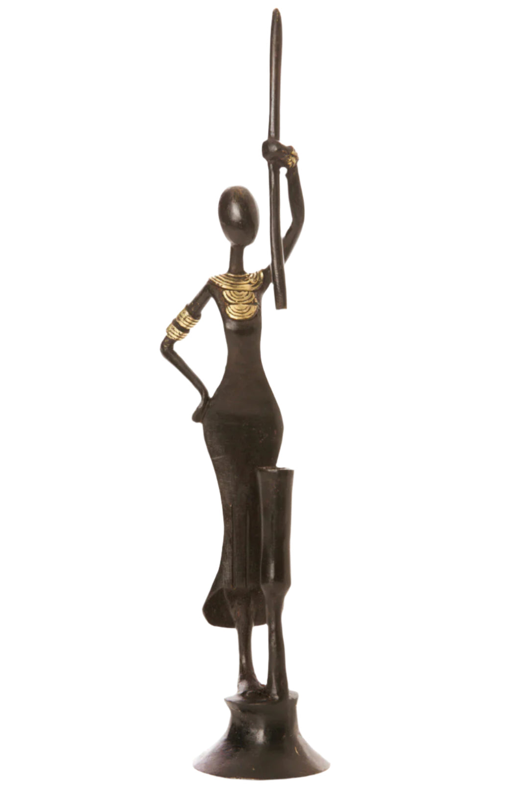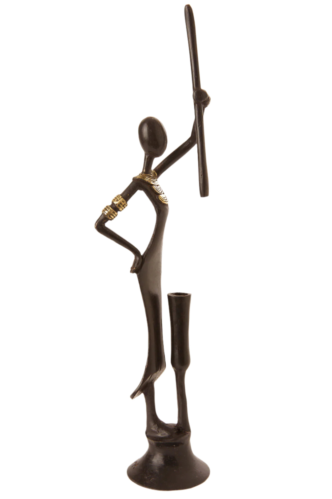 Metal sculptors in Burkina Faso use a lost-wax casting method to create beautiful works of modern African art. This intriguing sculpture portrays a woman in a tailored gown and lustrous jewelry working a mortar and pestle.