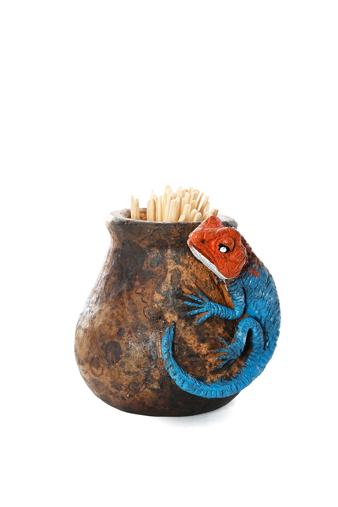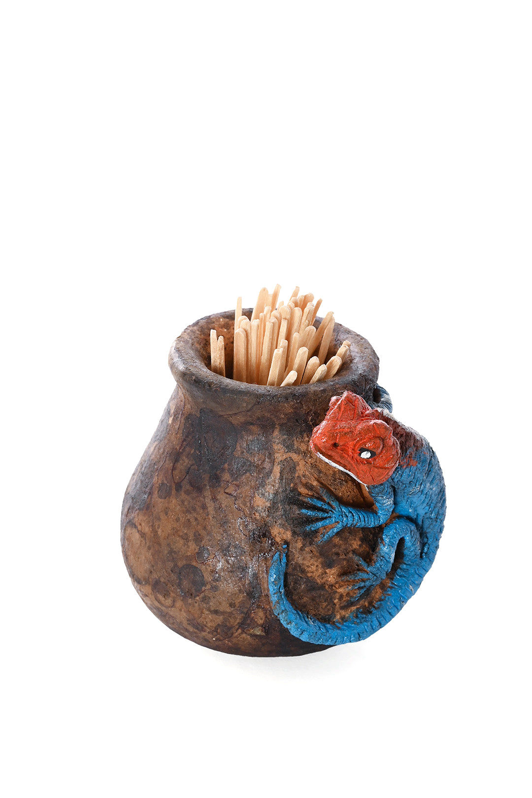 A small team of Kenyan ceramics artisans excel at fashioning functional art from clay. Their newest line of low-fired pottery pieces centers around agamas and other lizards, molded artfully in clay to bring a touch of Kenya's diverse natural world indoors. These rustic toothpick holders bring a touch of nature to the home.