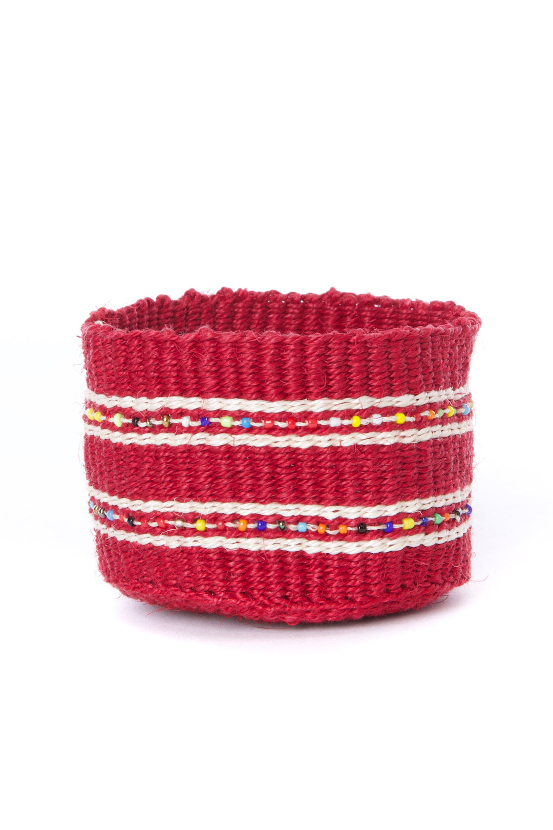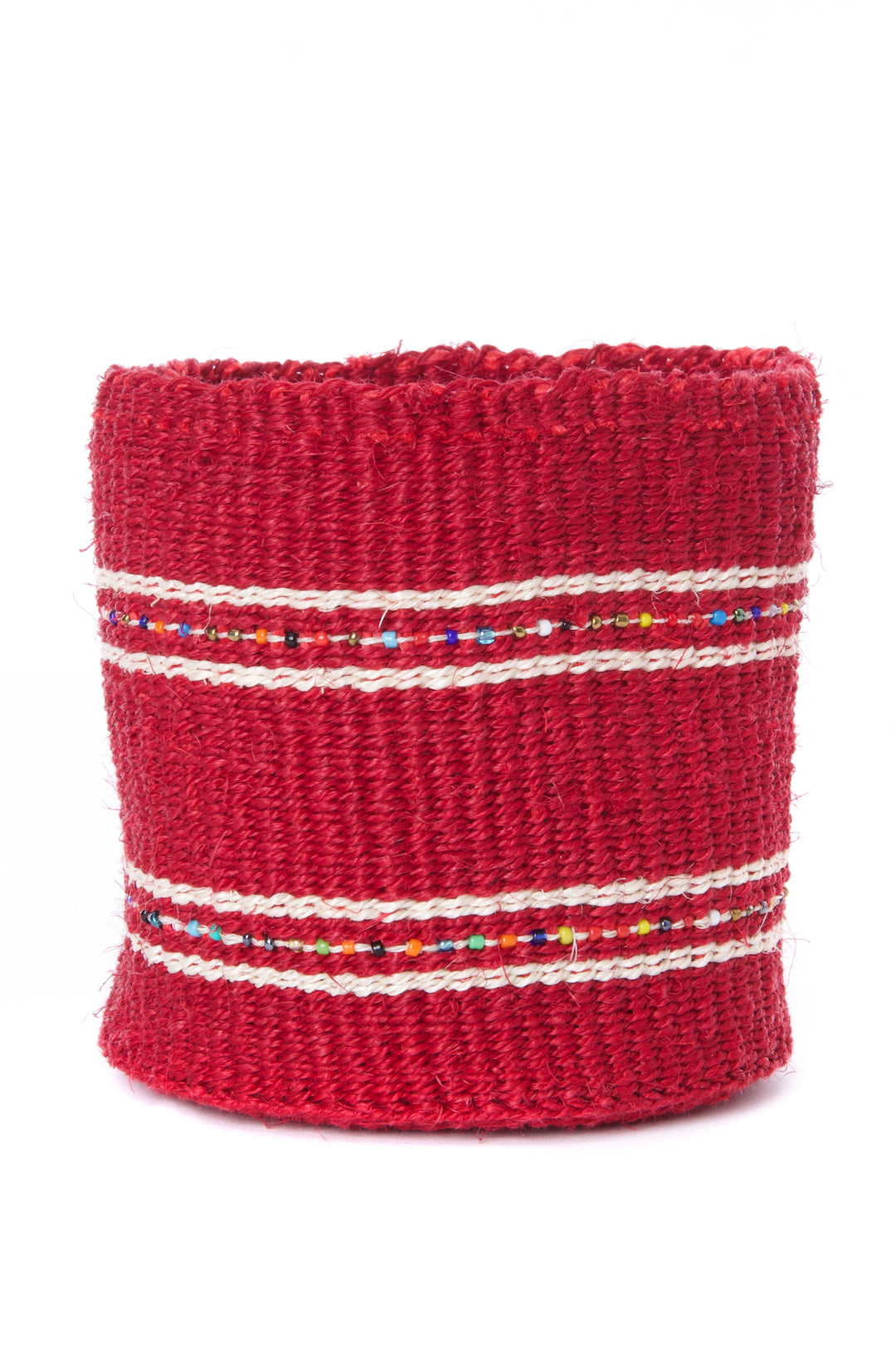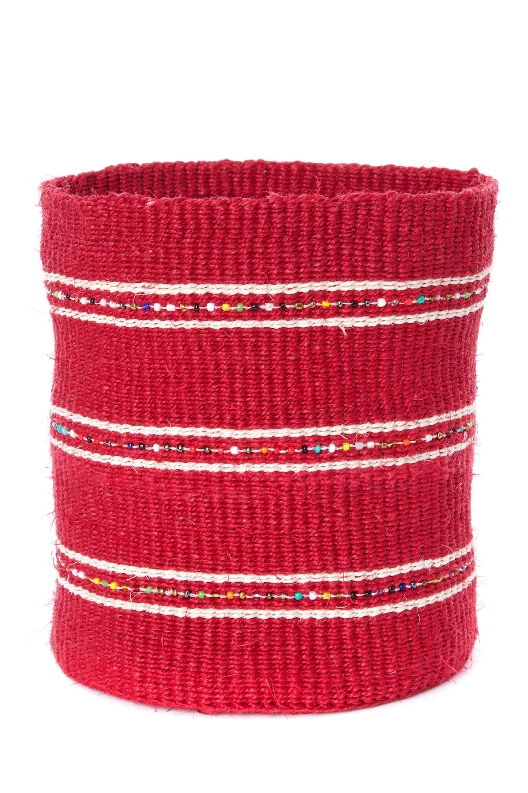 These finely woven storage baskets are handcrafted in Kenya from the fiber of the agave sisalana plant, dyed to a vibrant cherry red. More refined than our larger sisal baskets, these three little nesting containers are dressed up with colorful beads and can be used to store small items throughout the home.