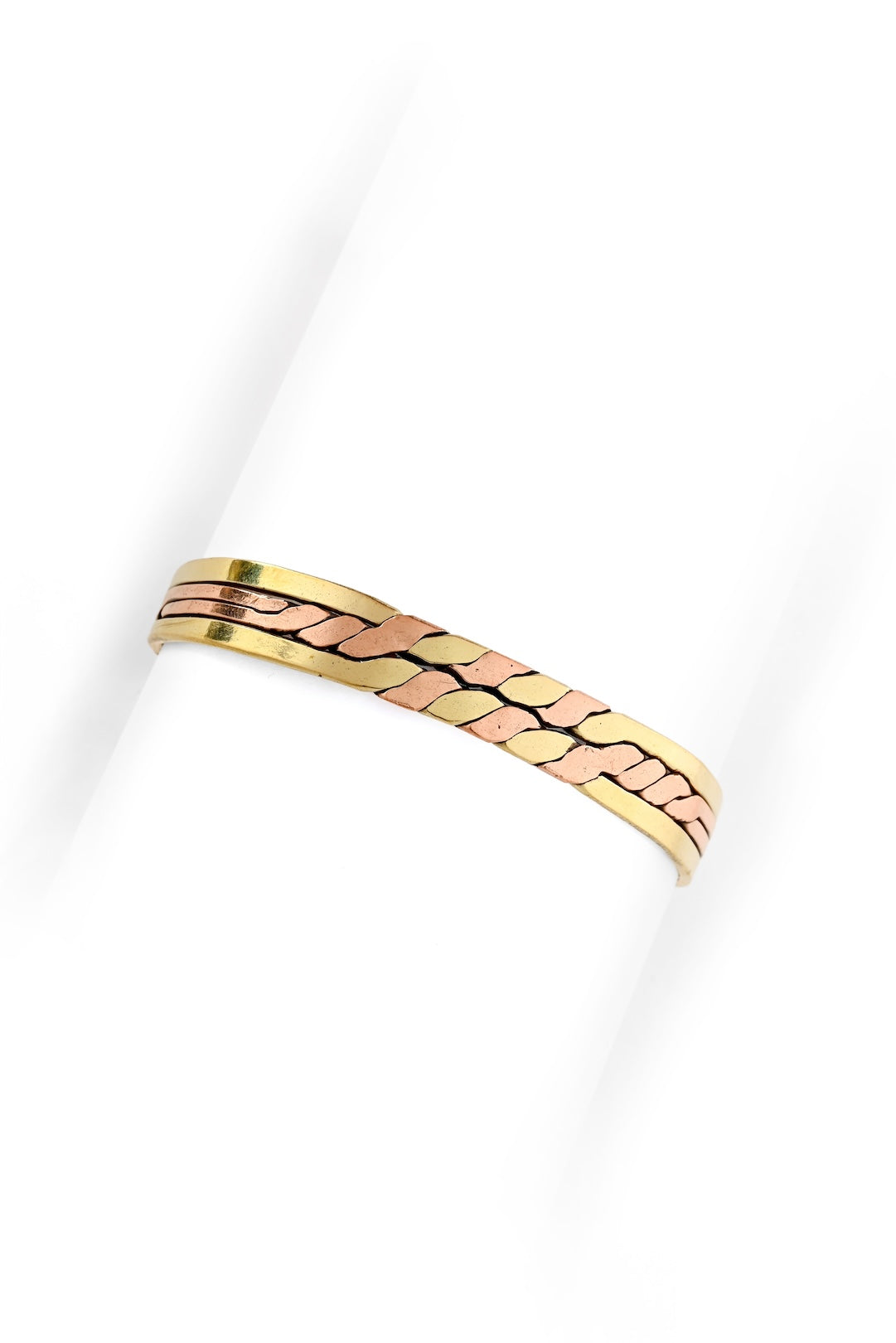 Handcrafted in Kenya from recycled copper and brass, this unisex bracelet features a gently twisted design that highlights the warm tones and raw beauty of the mixed metals, giving the piece a natural, organic feel. The open cuff style allows for easy, adjustable wear, while the interwoven metals create a timeless look rooted in traditional craft.