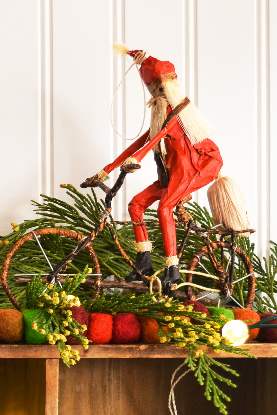 Kenyan artisans use dried banana leaf, corn husk, sisal, recycled paper and wire to portray Santa Claus making a last-minute Christmas delivery on his bicycle. Complete with a little sack of treats, this uniquely African ornament will be sought out to add to the tree, year after year.