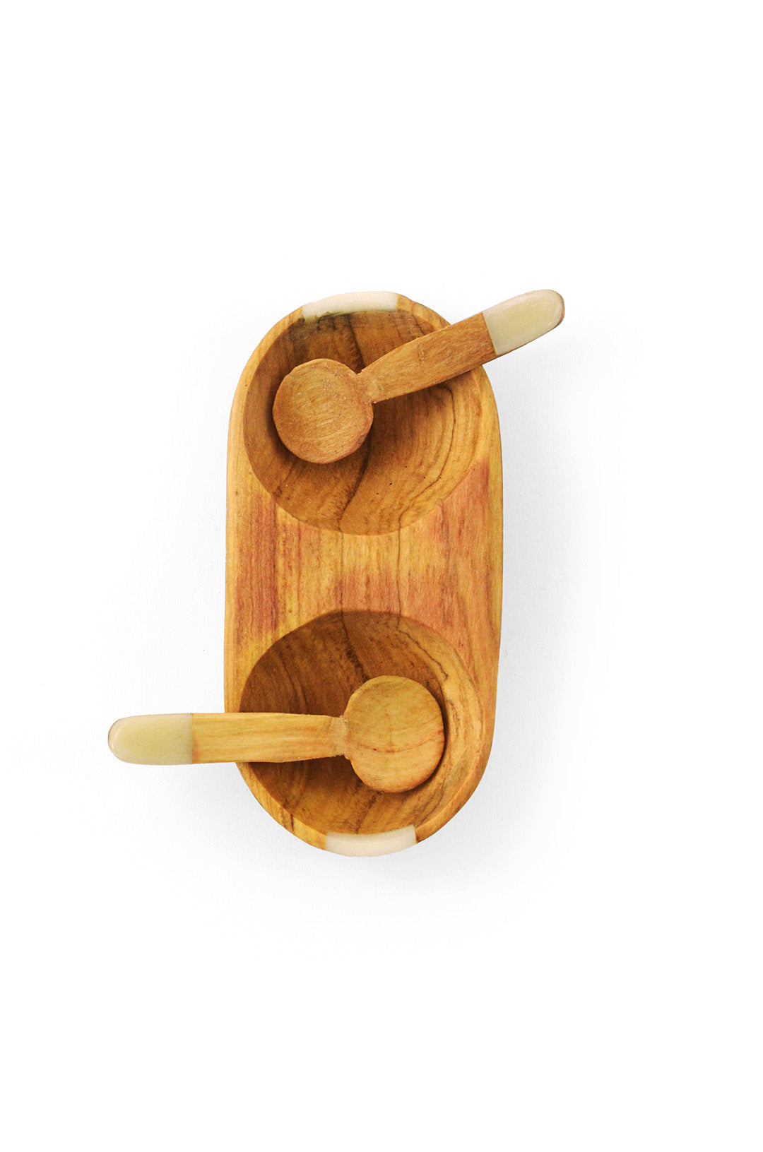 Double Wild Olive Wood & Natural Bone Spice Bowl with Spoons