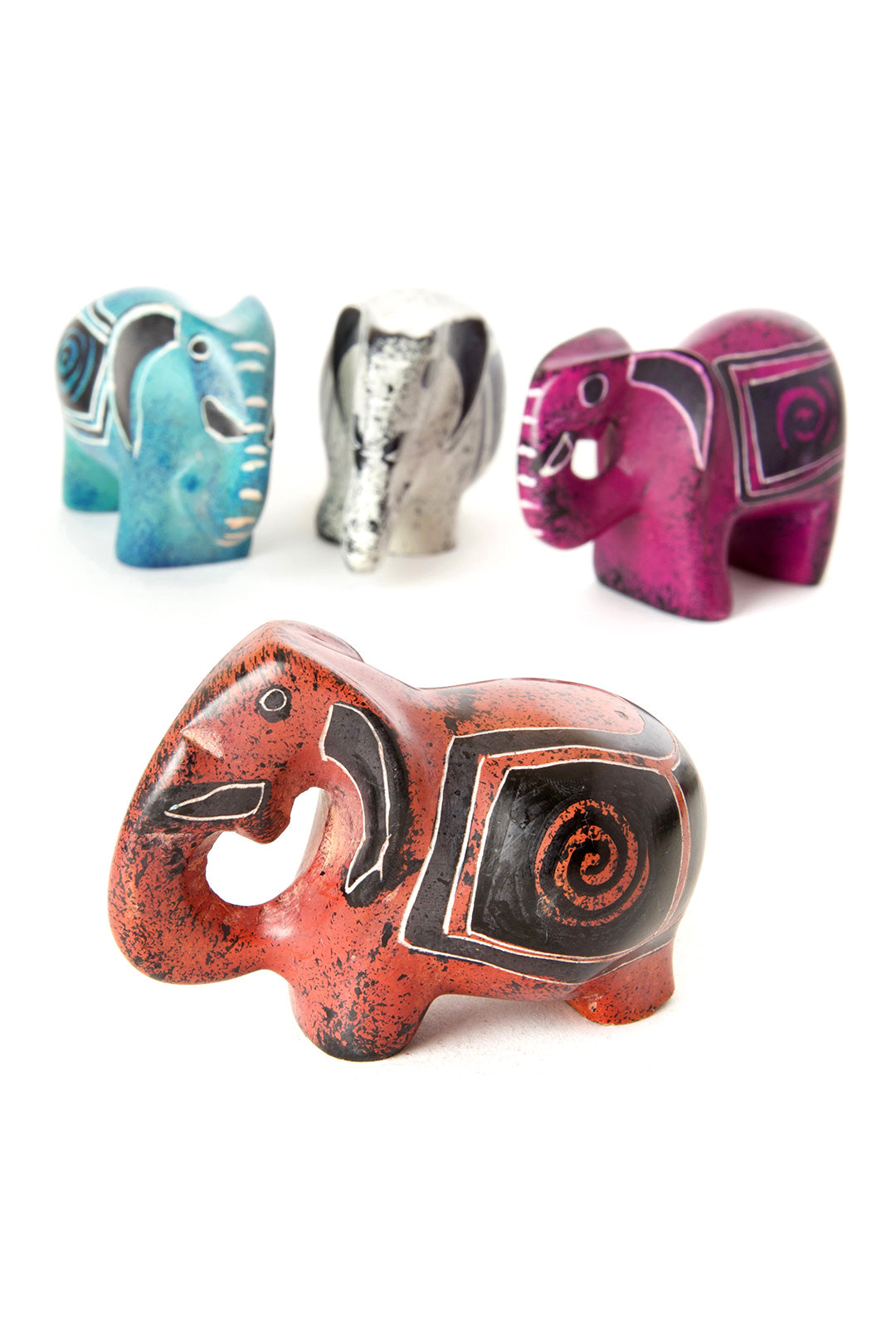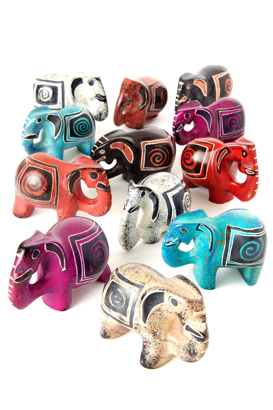 The talented artisans at Crafts Caravan in Kenya brighten hand carved soapstone elephant keepsake sculptures with colorful hand painted finishes. With a variety of colors available in the dozen, these little elephants make a sweet gift for people of all ages.