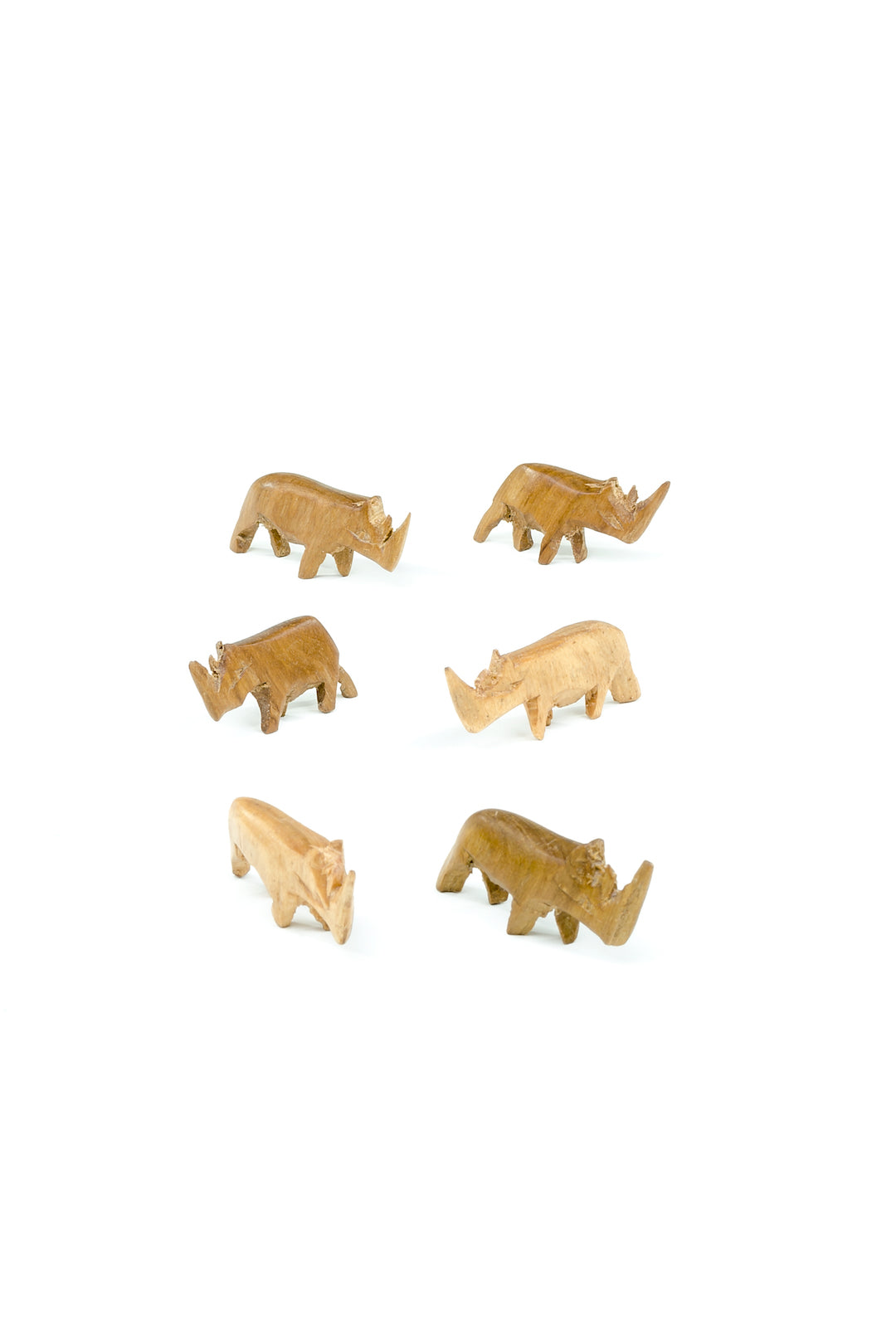 Kenyan artisans hand carve sweet safari animal miniatures from pale jacaranda wood. An inexpensive gift that appeals to many, our handcrafted wooden rhino keepsakes are sold as a set of twelve.