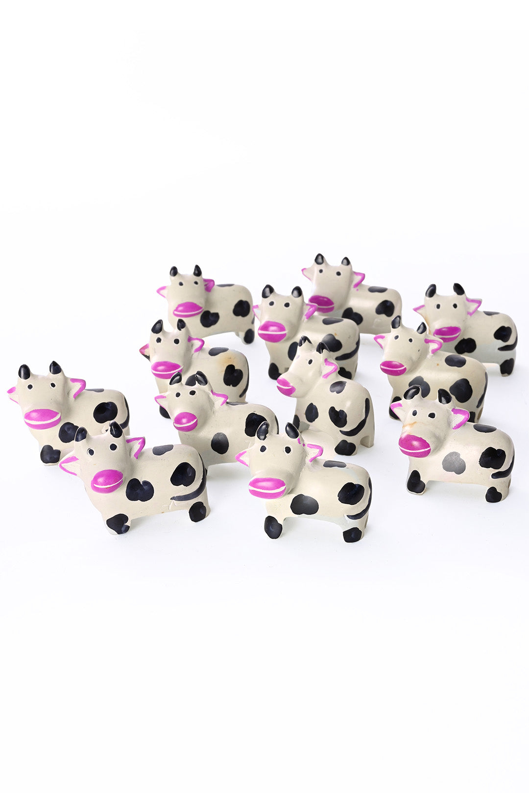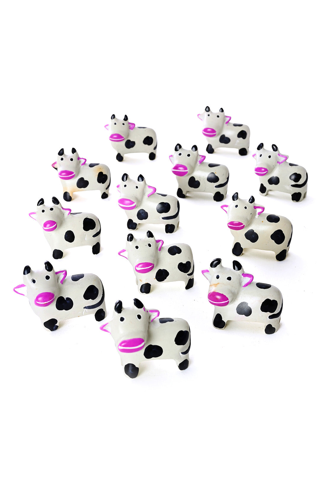 Kenyan artisans hand carve miniature cow sculptures from soft soapstone, then hand dye each piece with black spots and a pink nose.