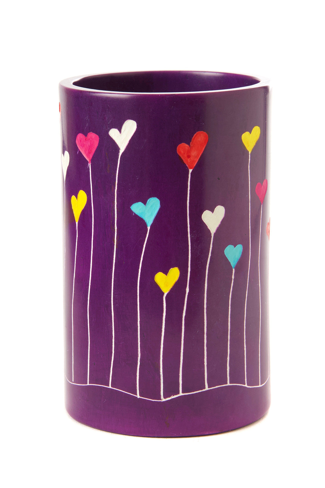 Kenyan artisans handcraft an uplifting decorative pen cup or vase by carving soft soapstone and adding a fanciful hand painted heart flower design. Matching pieces are also available to bring a joyful touch of global art to the home.