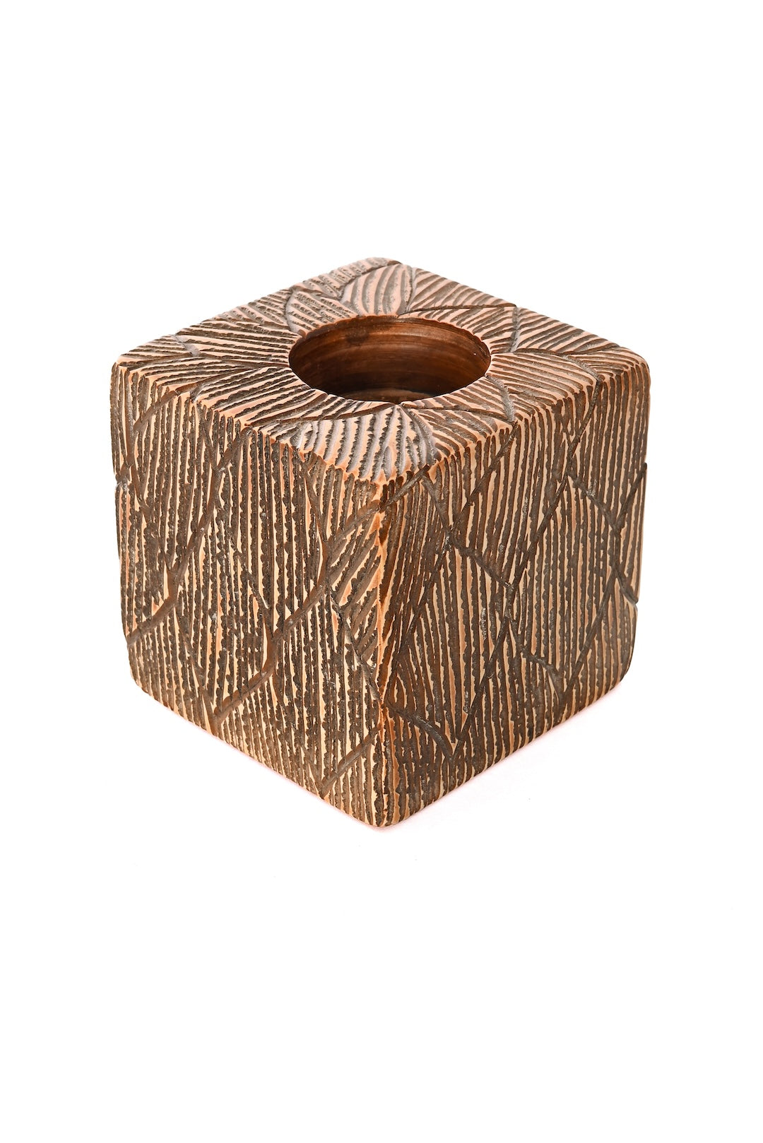 Carvers in Kenya's western highlands craft the basic form for a cube tea light candle holder from soft soapstone. Artisans in a Nairobi workshop then add a rust-orange dyed finish and leaf inspired etched details.