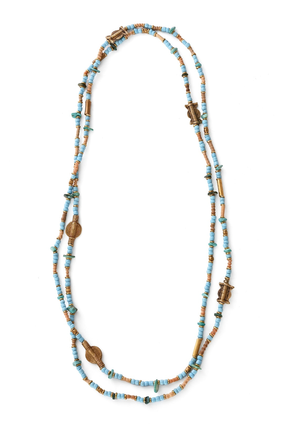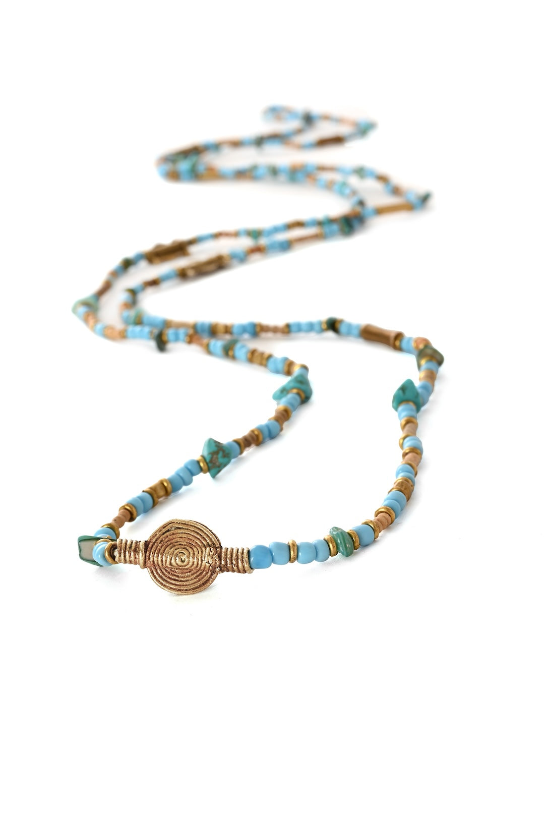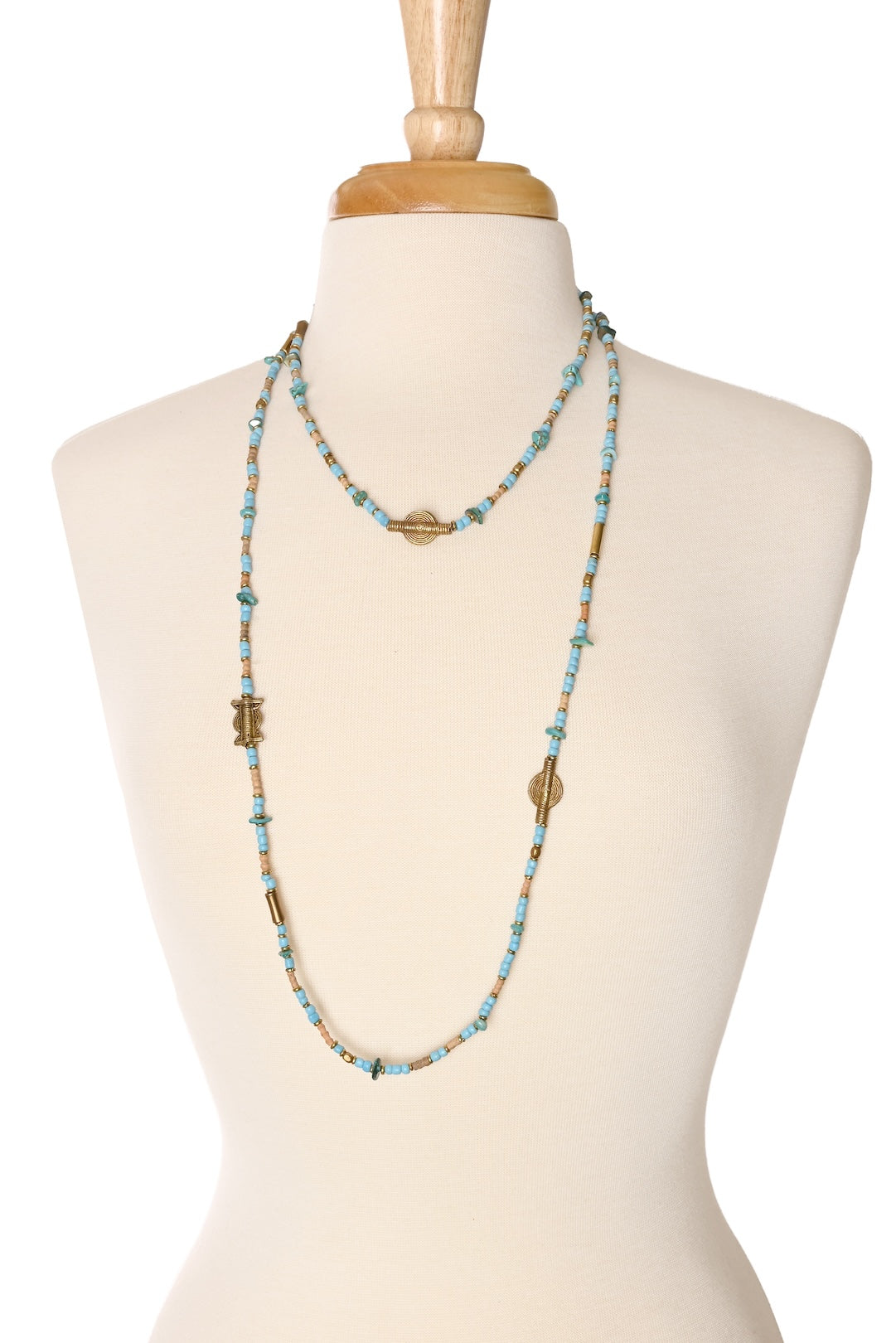 Handcrafted by skilled Kenyan artisans, this extra-long wrap necklace features hand-formed ceramic beads in vibrant turquoise blue paired with warm, golden brass accents. Textured brass medallions add organic detail throughout. Wear it long and loose or wrapped for a layered, gathered look.