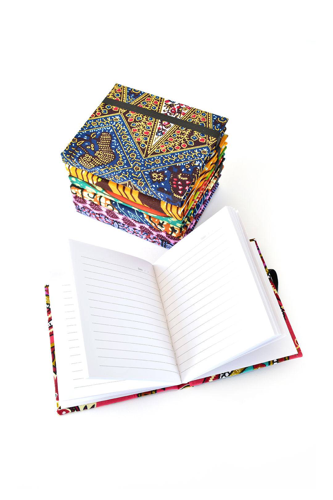 Ghanaian artisans create these sweet little notebooks with vibrant patterned ankara cotton cloth. Each mini notebook includes 75 lined sheets (150 pages) and an elasticized band for keeping the pages closed.