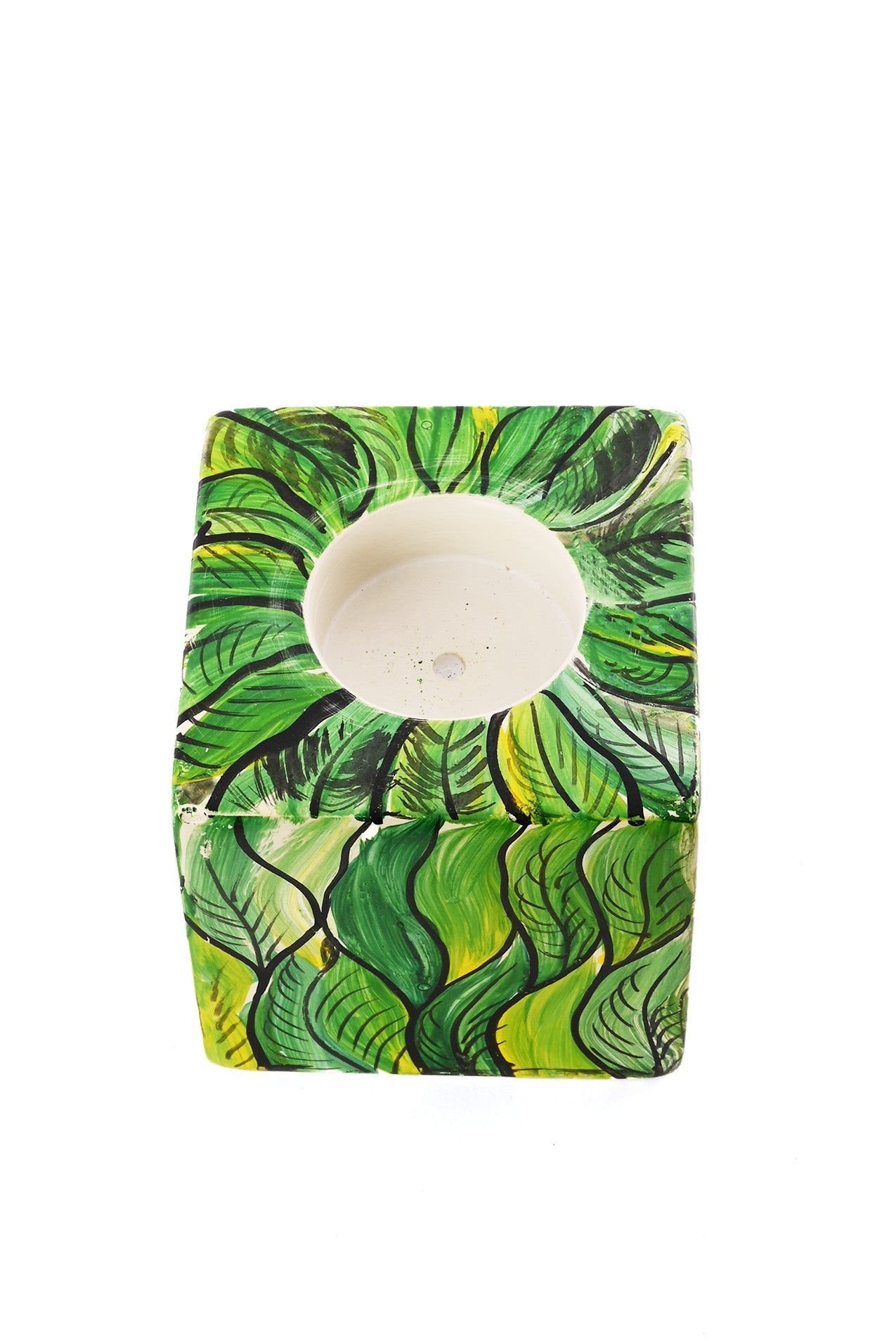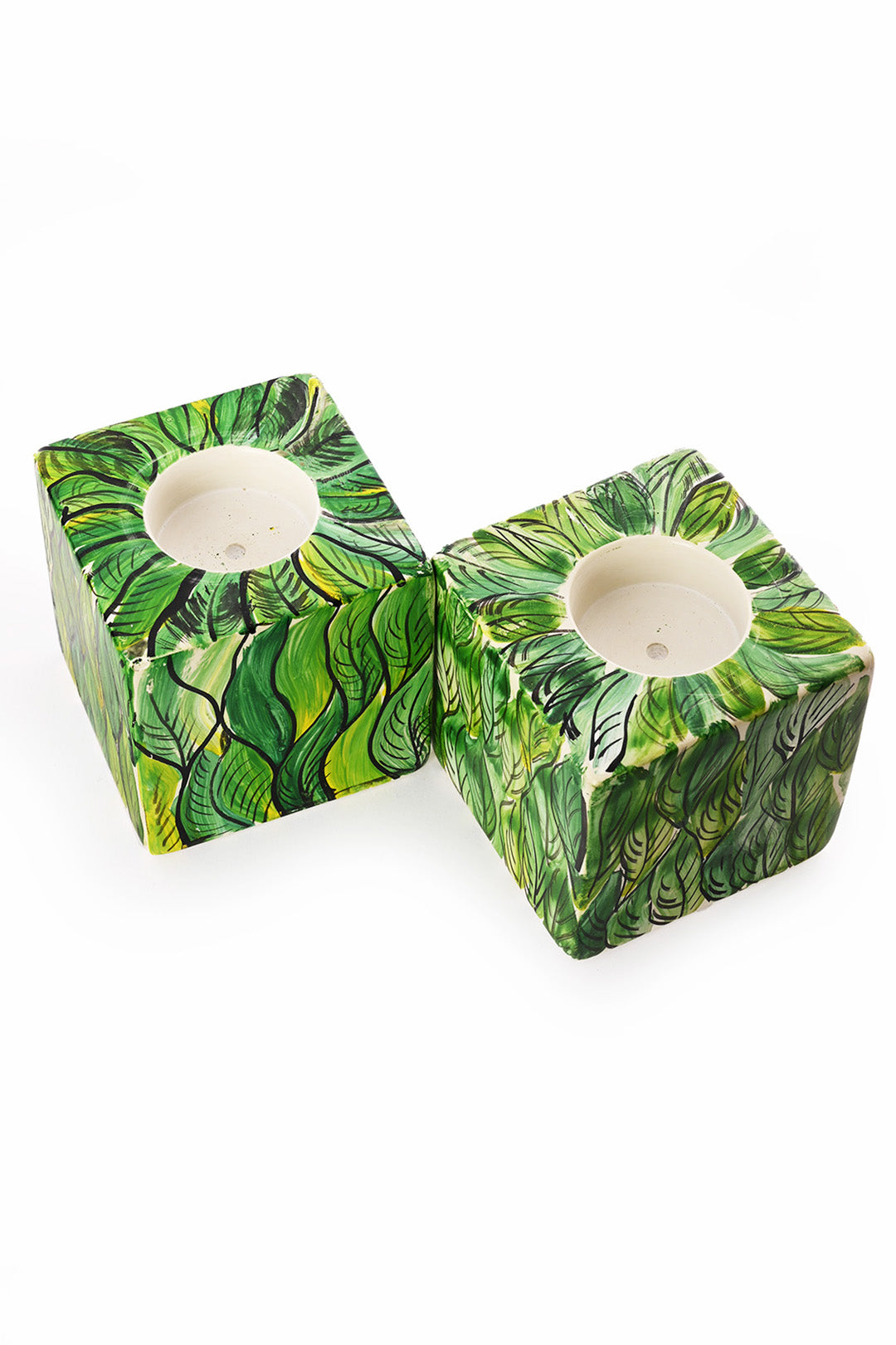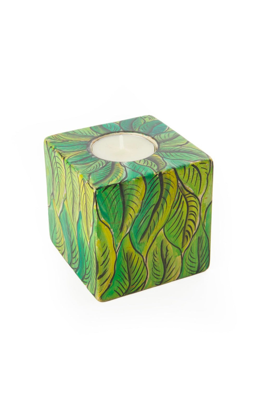 Carvers in Kenya's western highlands craft the basic form for a cube tea light candle holder from soft soapstone. Artisans in a Nairobi workshop then then add a hand-painted finish of lush, green foliage.