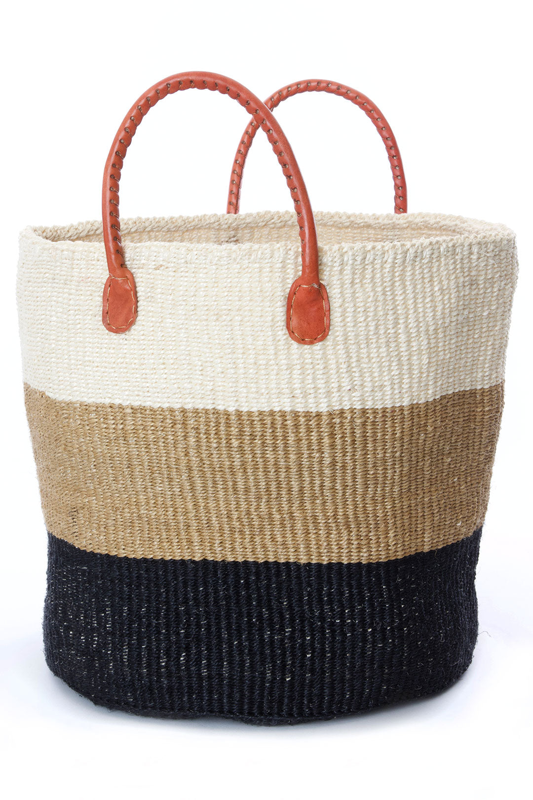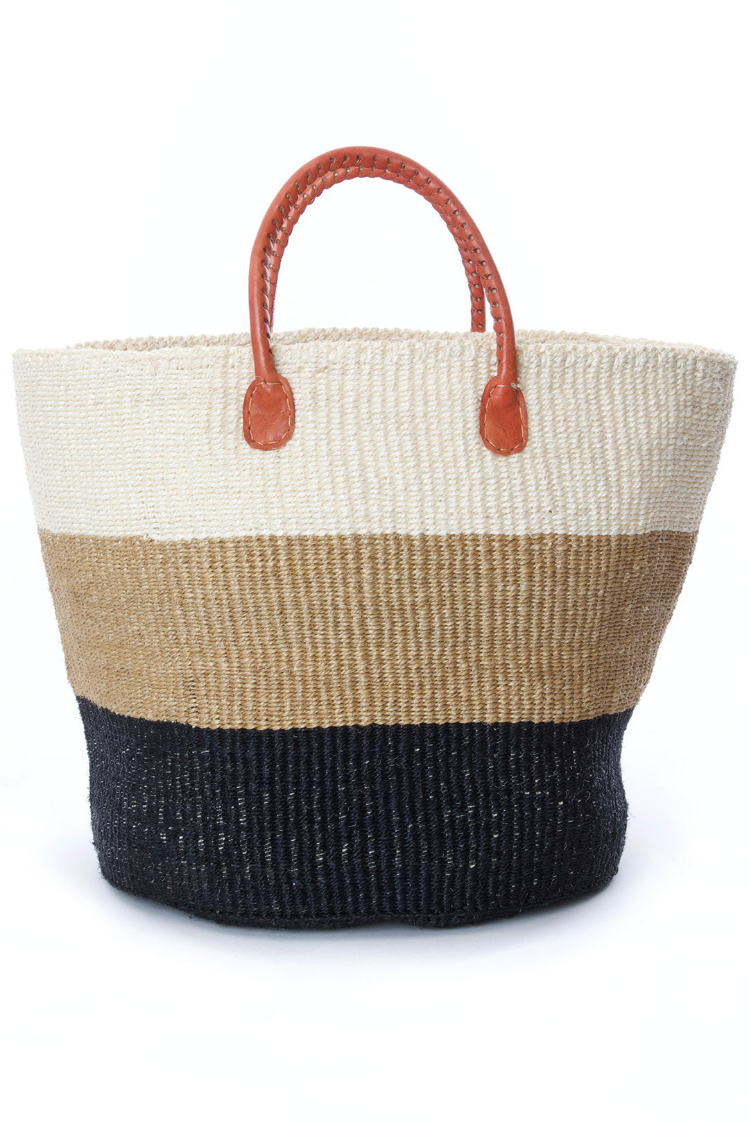 This bestselling tote is hand woven from sisal fiber by rural Kenyan women, then finished with soft leather handles. Sisal grows well in the semi-arid climate of eastern Kenya, and its spiky leaves contain long fibers that can be extracted for weaving. Rural Kamba women excel at weaving the tough fiber into stylish accessories prized around the world.