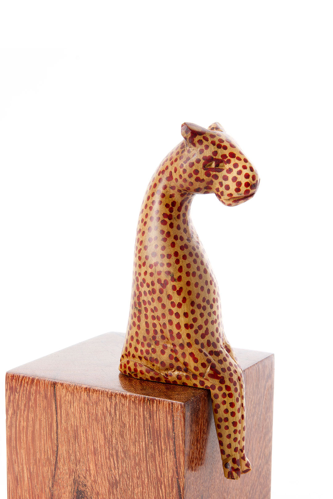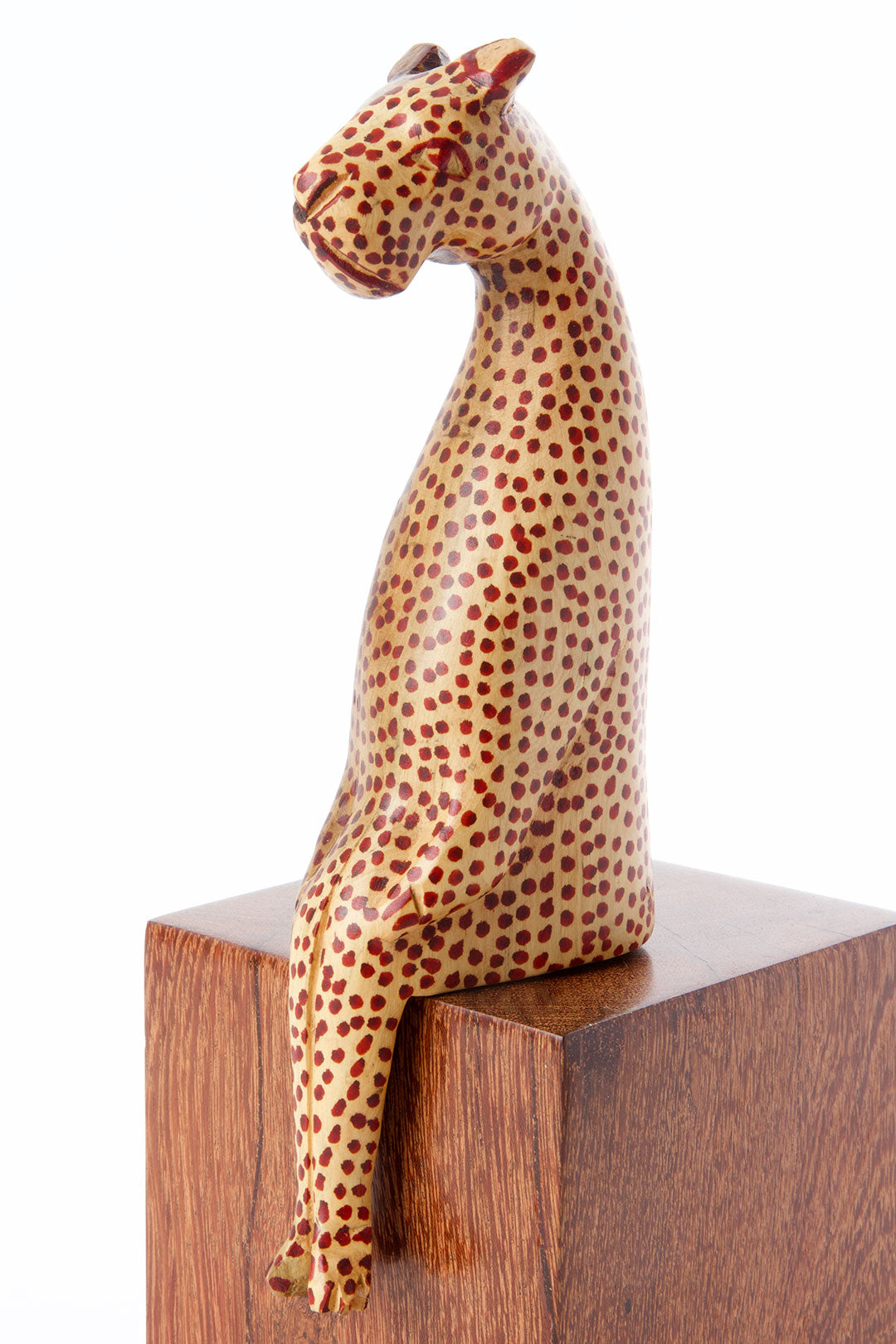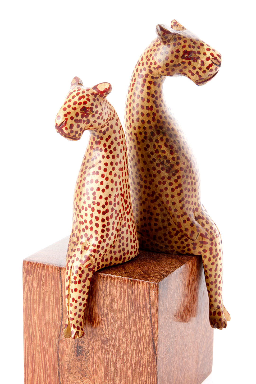 Kenyan wood carvers craft these whimsical folk art leopard sculptures from locally sourced jacaranda wood. Available in two sizes, each leopard is carved to be perched on a ledge, and is brightened with hand painted spots.
