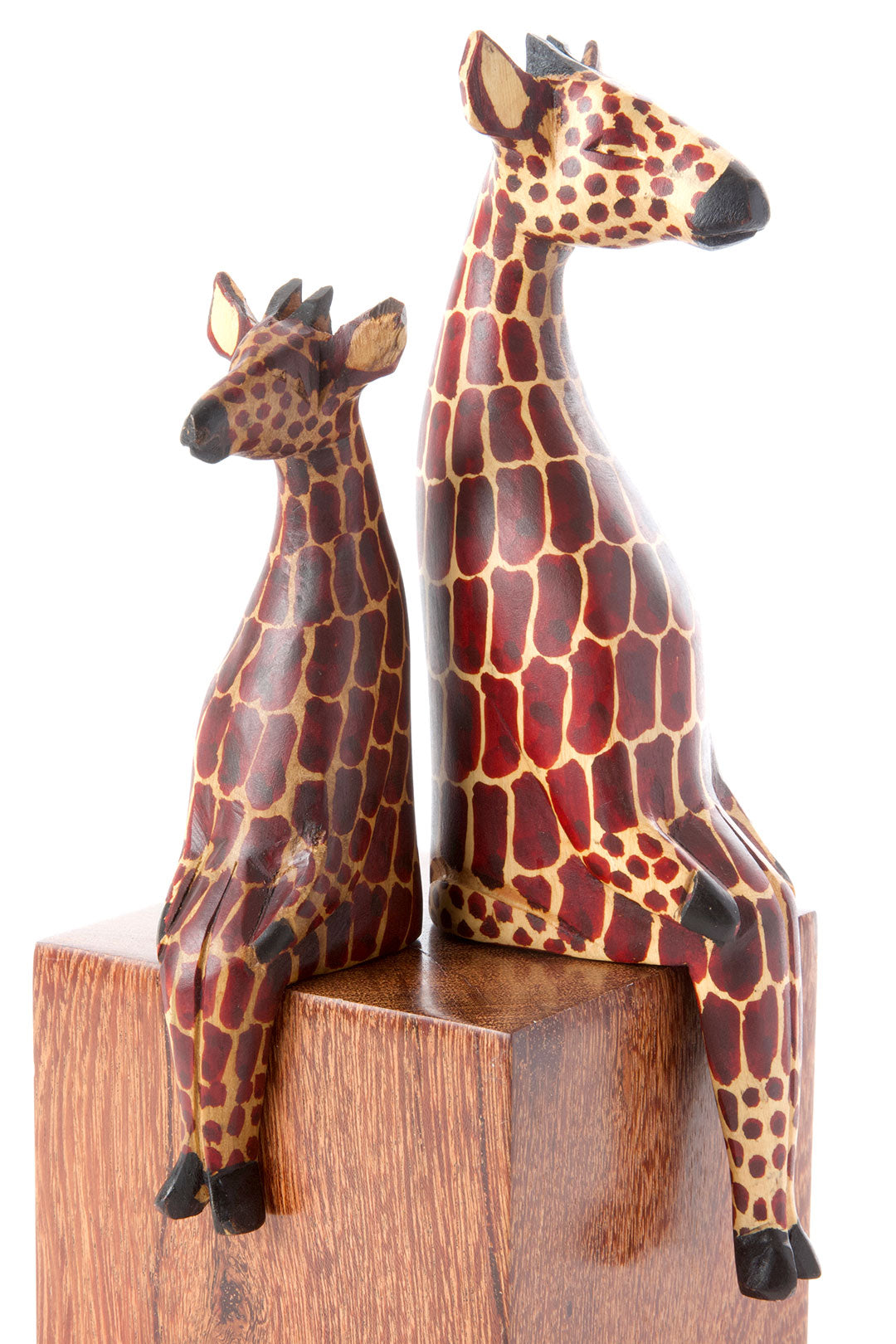 Kenyan wood carvers craft these whimsical folk art giraffe sculptures from locally sourced jacaranda wood. Available in two sizes, each giraffe is carved to be perched on a ledge, and is brightened with hand painted spots.