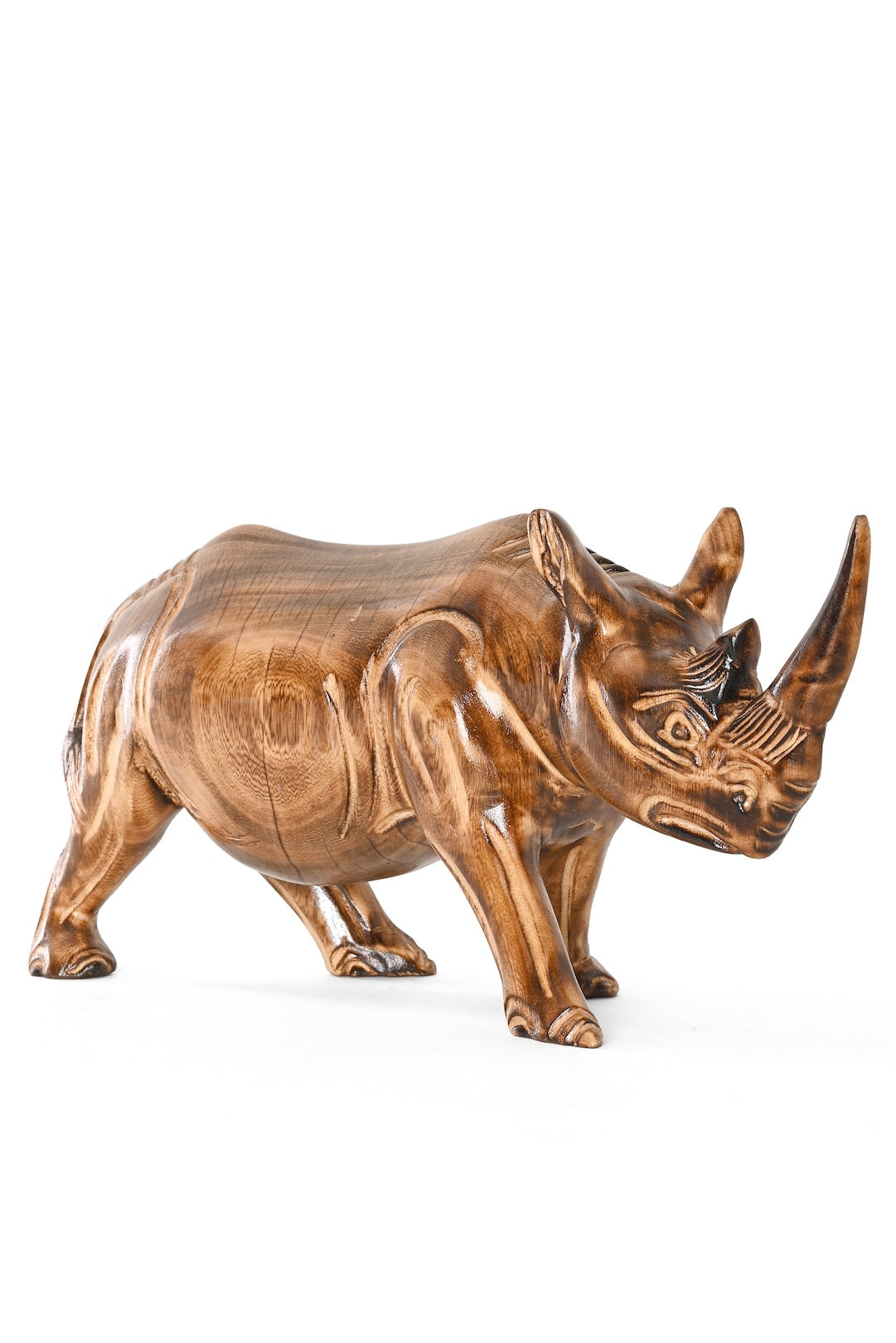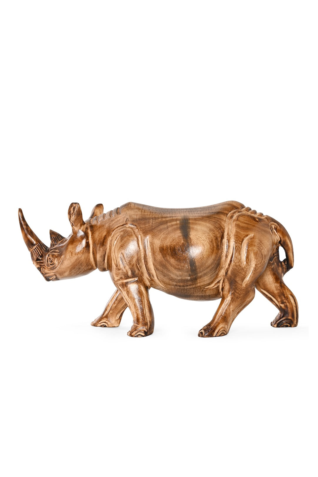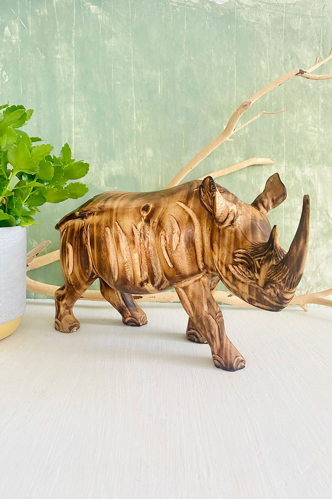 Talented Kenyan carvers carve this beautiful rhinoceros sculpture from jacaranda wood, finished with burned contours and a glossy clear coat. Because these sculptures are fully handmade, each rhino exhibits its own characteristics.