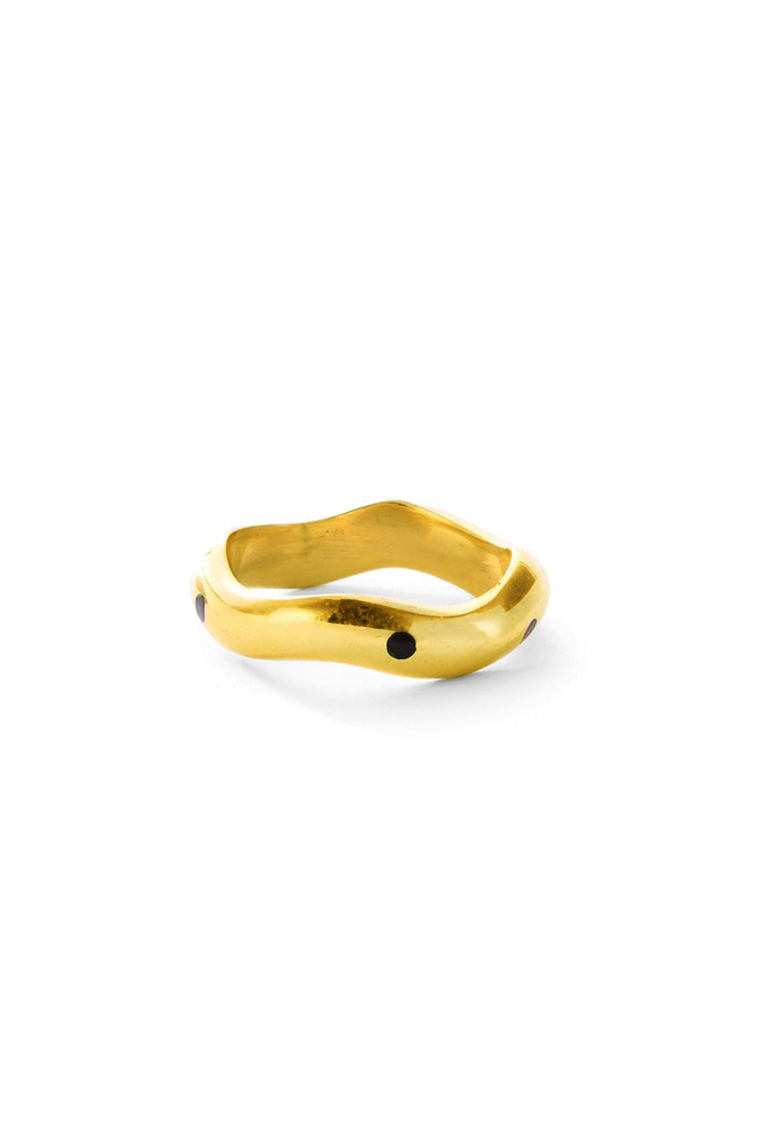 Talented Kenyan artisans shape this playful ring from polished brass, which is then accented with small incised pieces of dark cow horn. Pairs perfectly with the Kenyan brass wavy dot bangle.