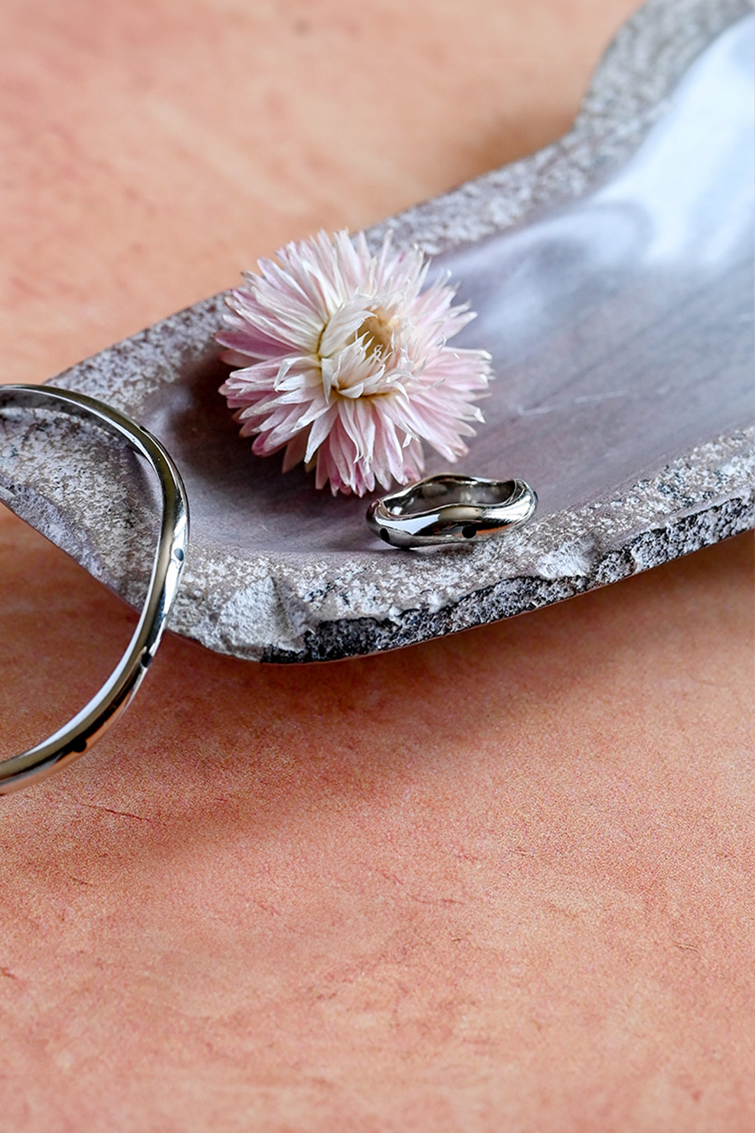 Talented Kenyan artisans shape this playful ring from polished silvertone brass, which is then accented with small incised pieces of dark cow horn. Pairs perfectly with the Silvertone Wavy Dot Bangle.