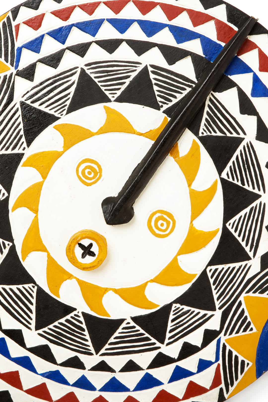 Hand carved by Bwa artisans living in Ghana, these beautiful sun masks are inspired by elements of traditional Bwa (Bobo) ceremonial masks and art. Hand-painted with white, blue, golden yellow, and brick red, these iconic masks make stunning modern African wall art. Mask comes ready to display with a single hanging loop on back.