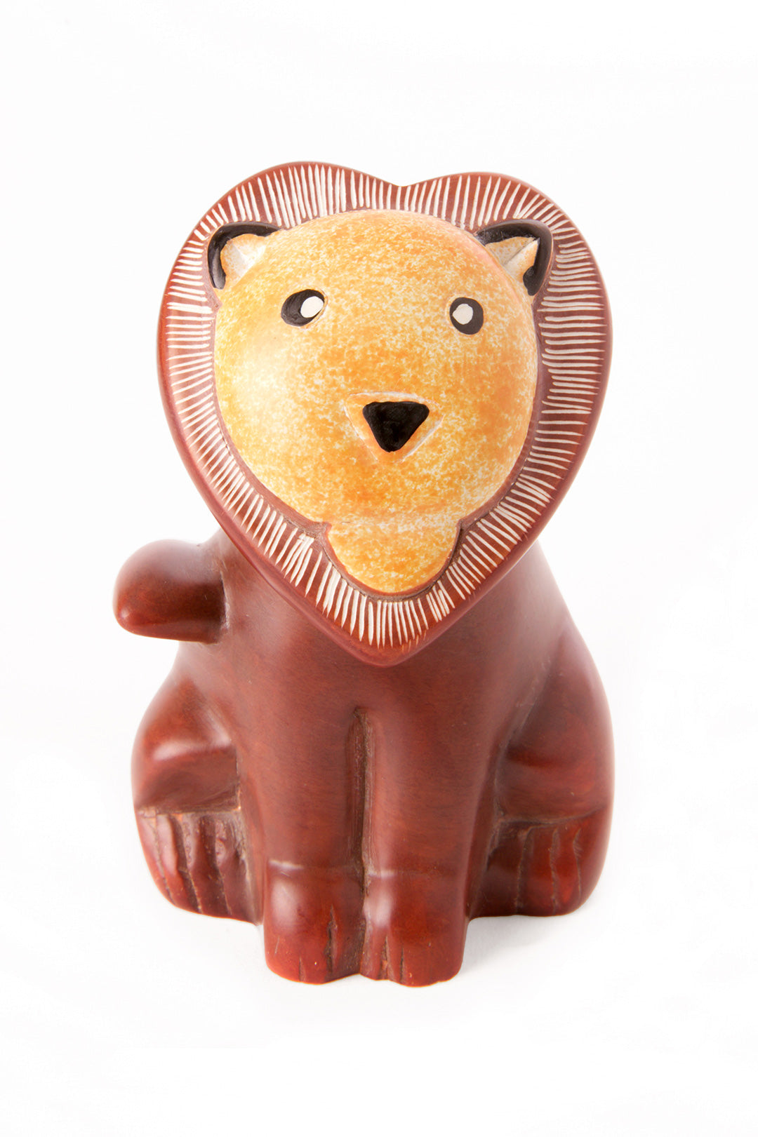 Kenyan artisans hand carve this lovable lion from soft soapstone, then hand dye with warm shades brown. The heart-shaped mane add some serious sweetness.