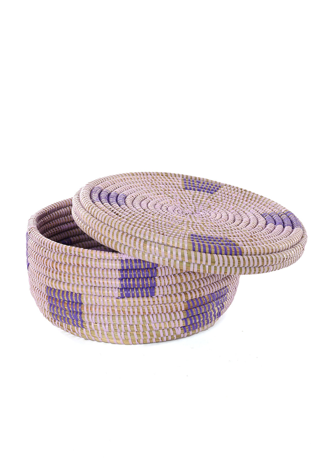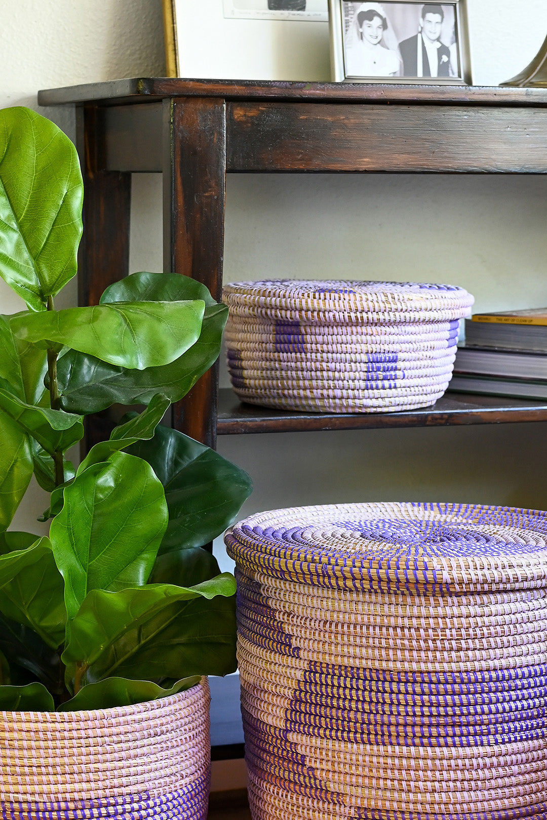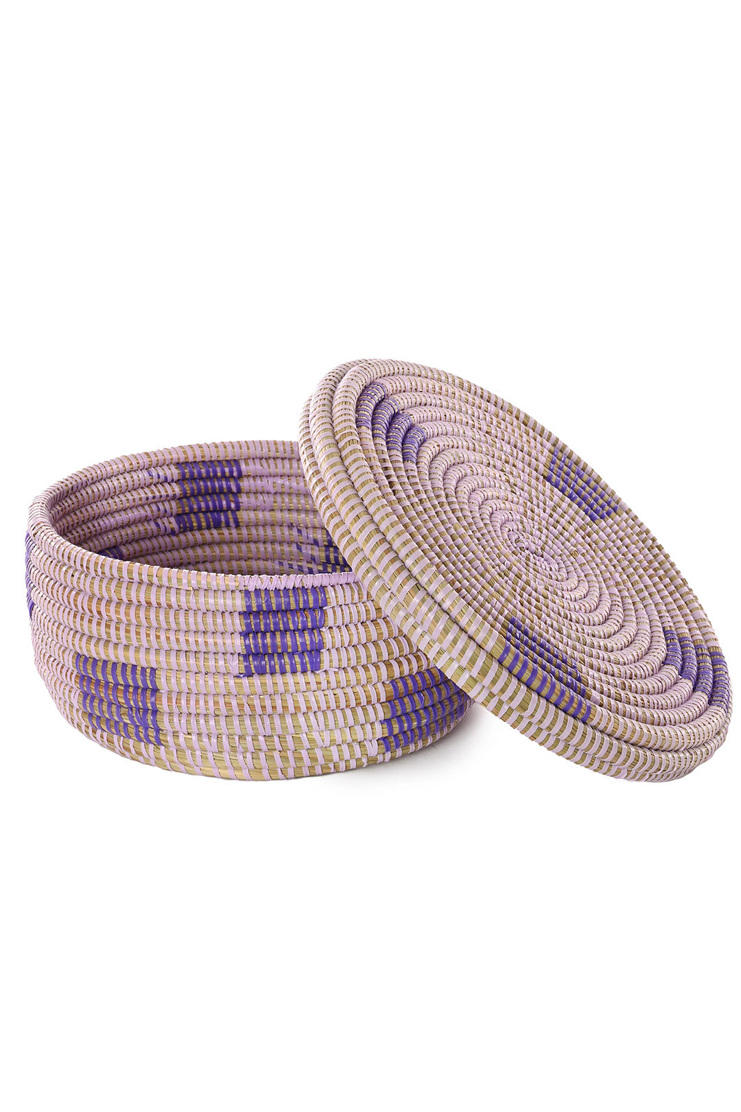 Wolof women in Senegal weave this purple and lavender storage container by binding cattail stalks with colorful strips of plastic purchased as salvaged end cuts at a mat factory in Dakar.