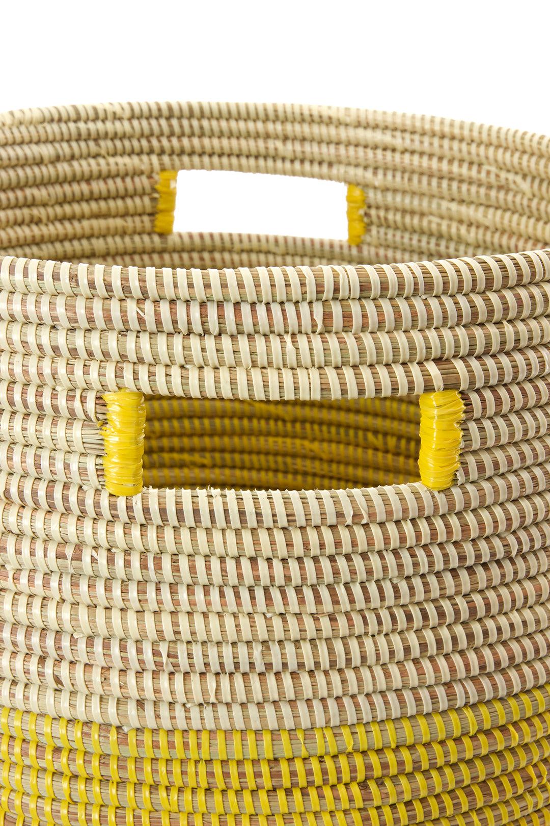 This stylish African laundry hamper is woven from cattail stalks and strips of plastic by rural women in Senegal, West Africa. Cut-out handles and a flat lid add to the classic appeal of this cream and yellow handmade storage basket.