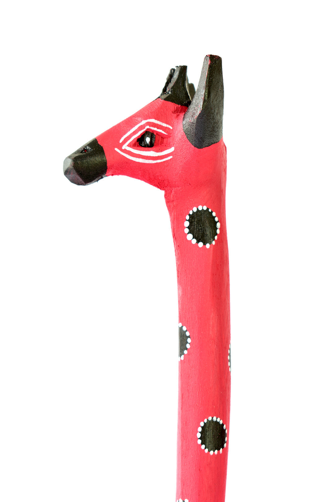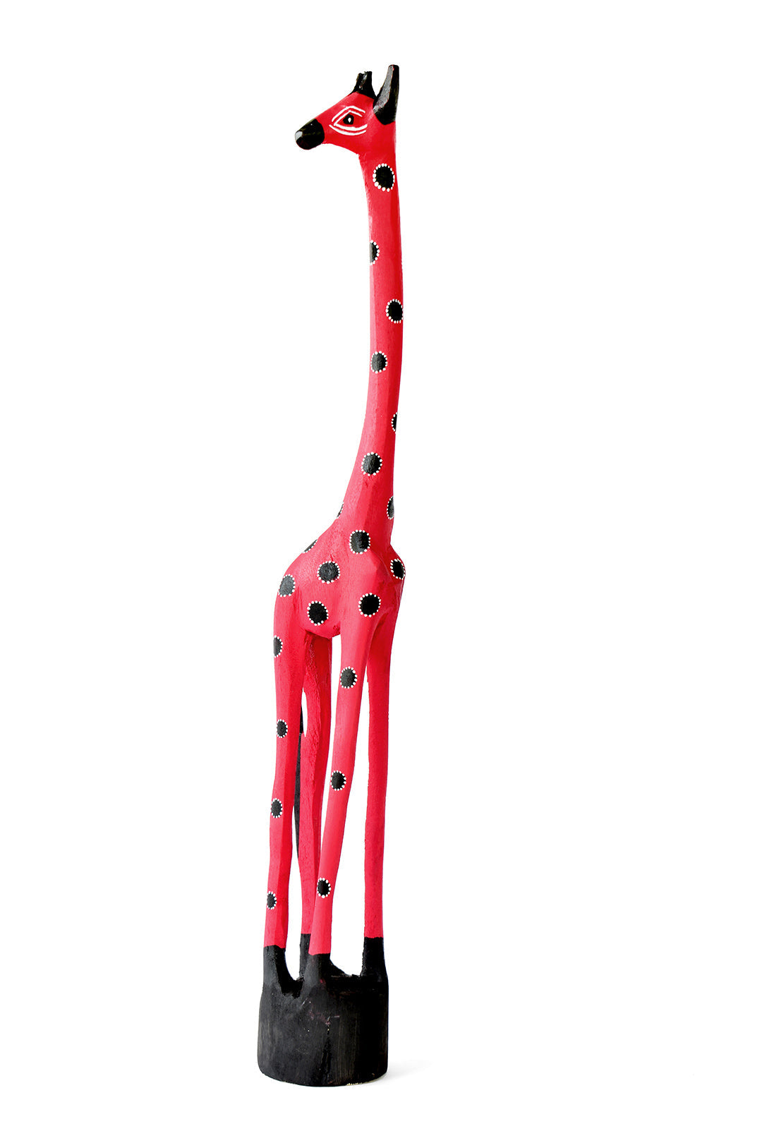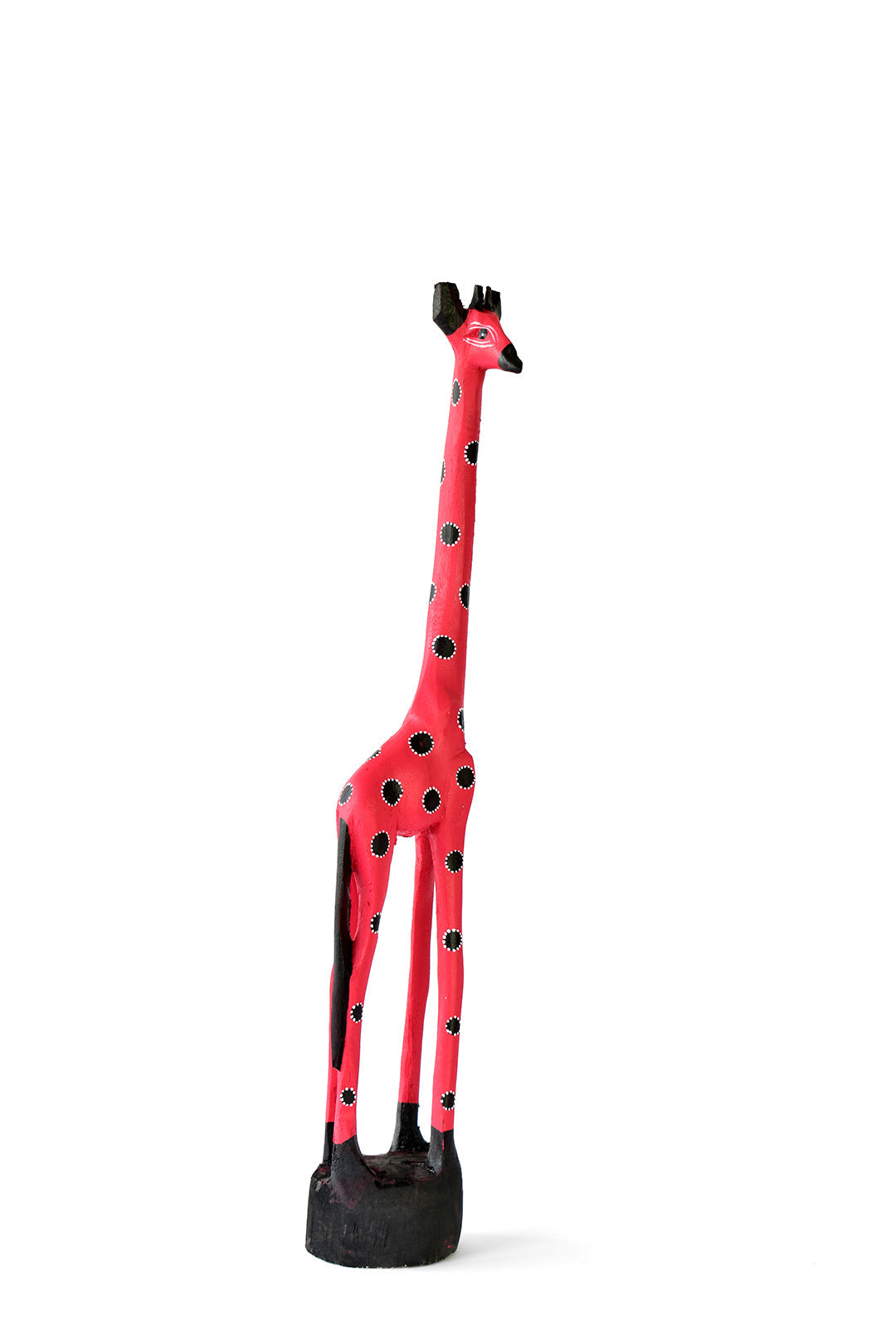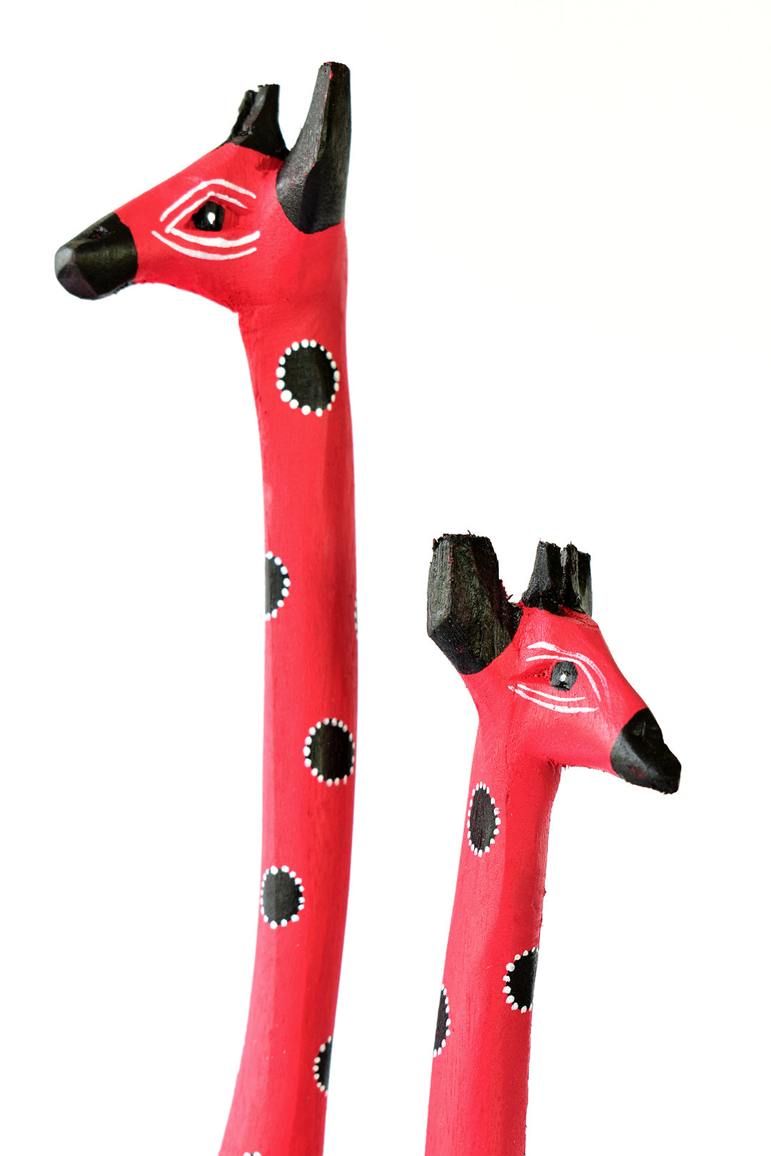These bold giraffe sculptures showcase the talent of Kenyan wood carvers and painters. Using sustainably-sourced jacaranda wood painted with acrylic, carvers create classic safari-themed folk art with a modern twist.
