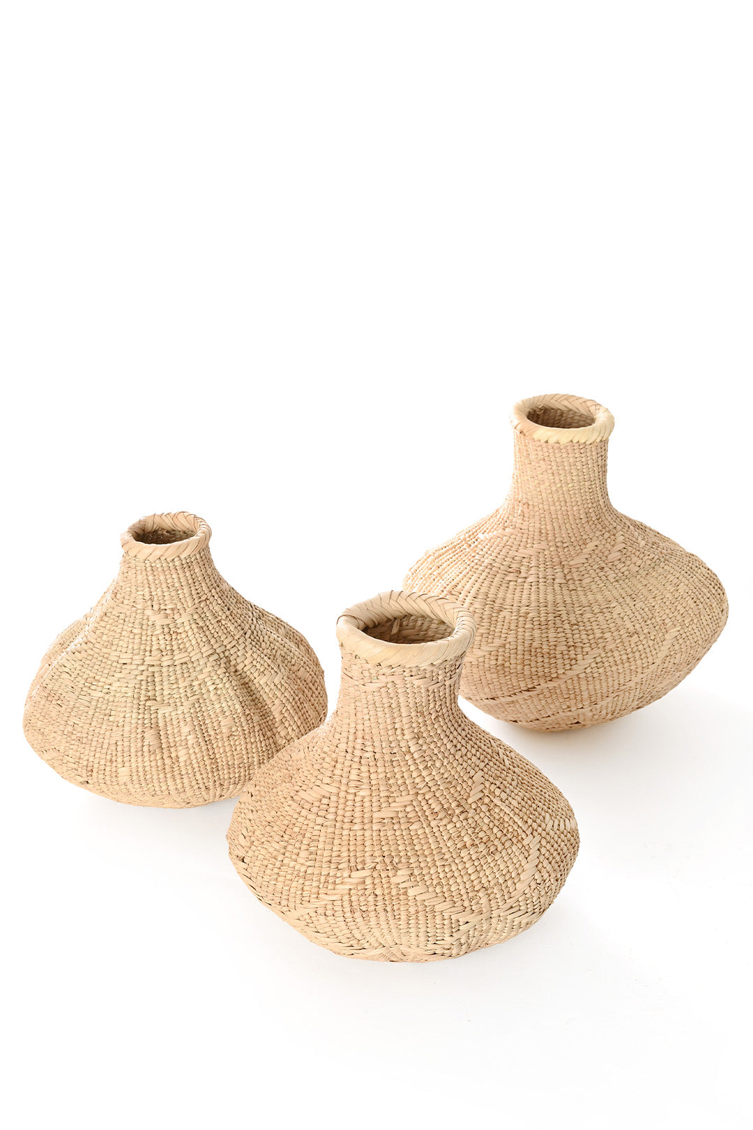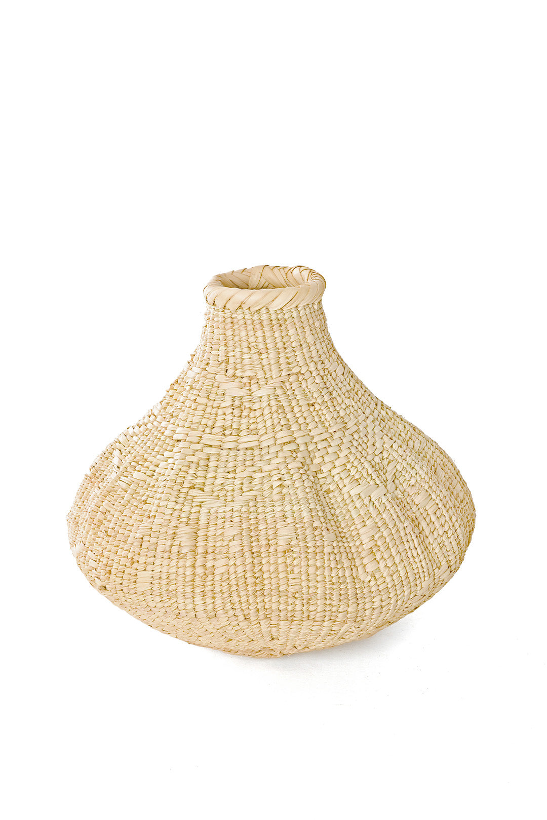 In the Binga District of northern Zimbabwe, skilled BaTonga women craft these iconic baskets from locally harvested palm leaves and wild twigs. Shaped like calabash gourds, each basket has a one-of-a-kind shape. The BaTonga people once farmed fertile land that was flooded by the damming of Lake Karibu, so weavers displaced across the lake demonstrate similar yet clearly distinctive styles.