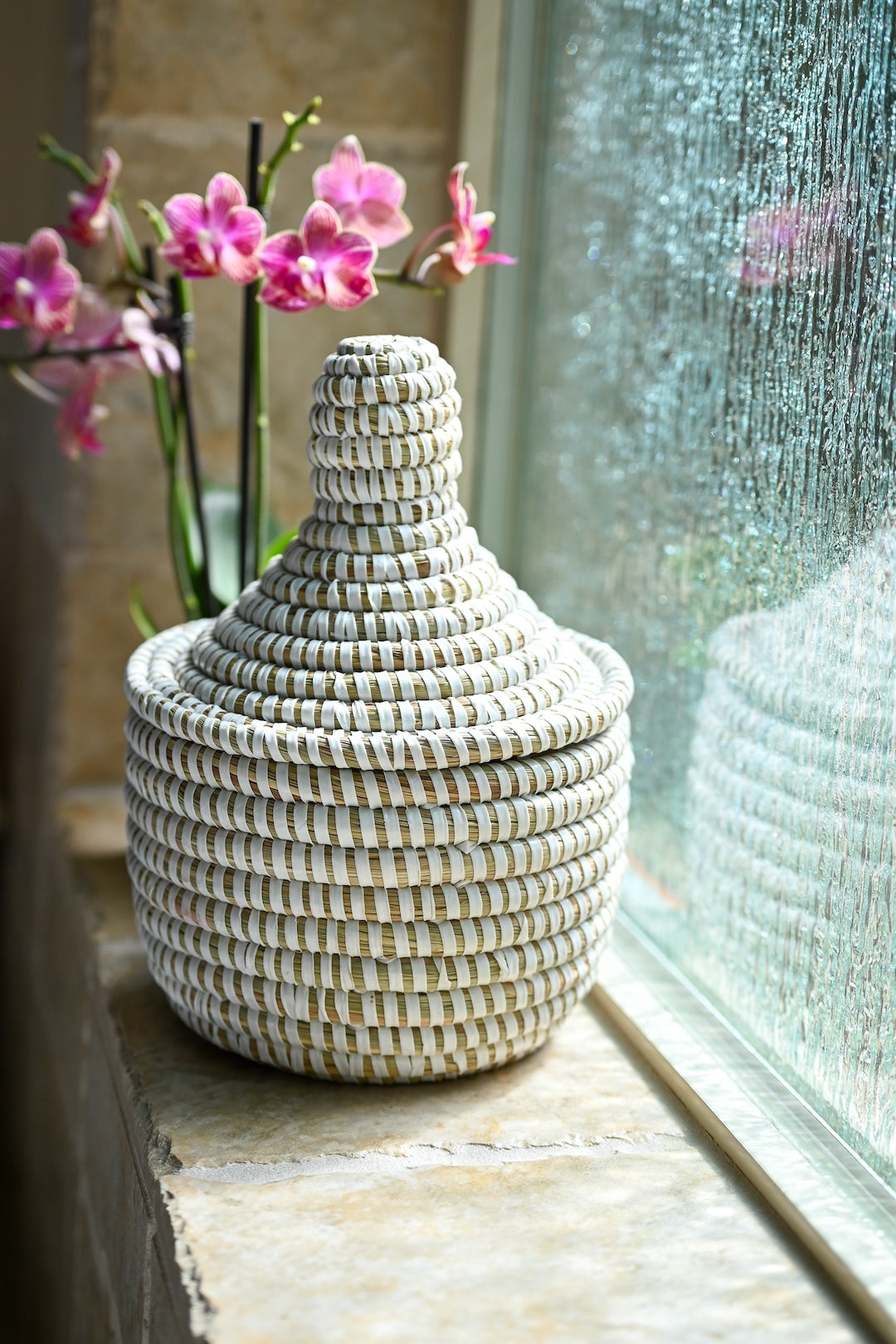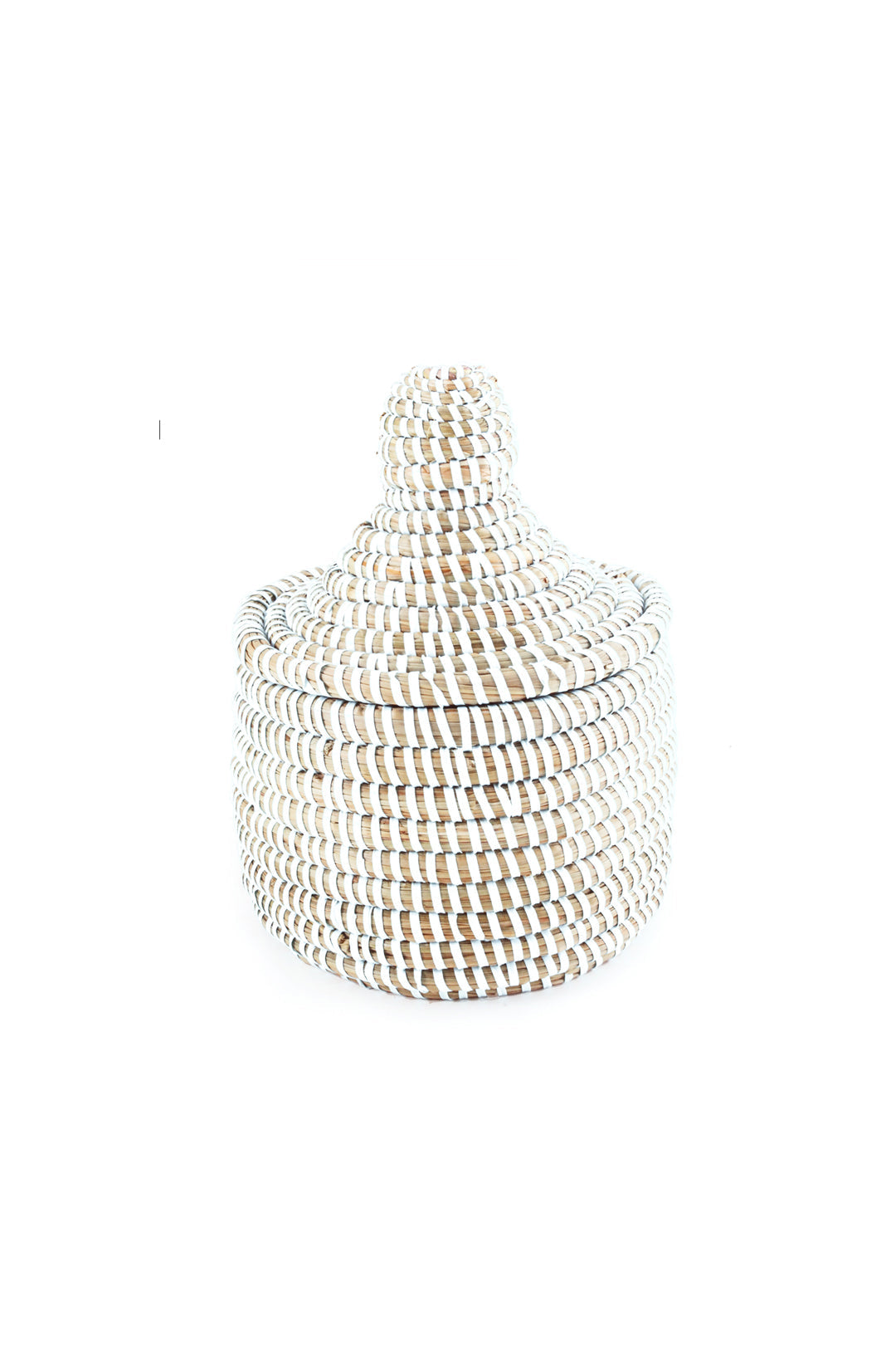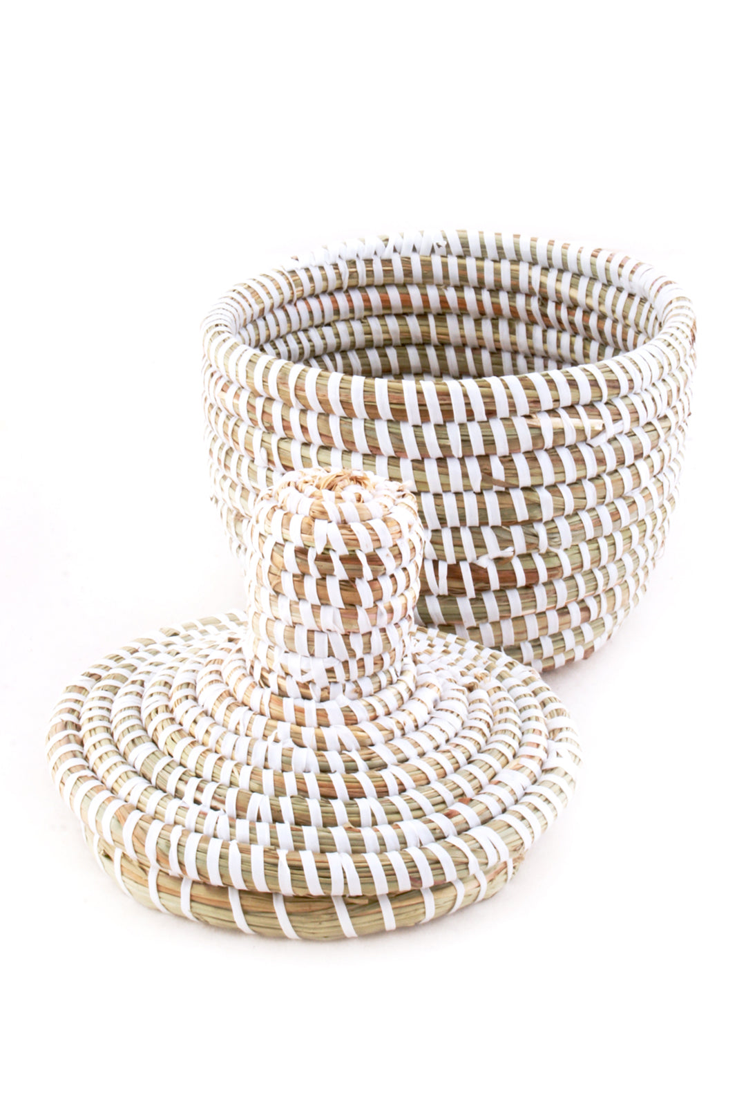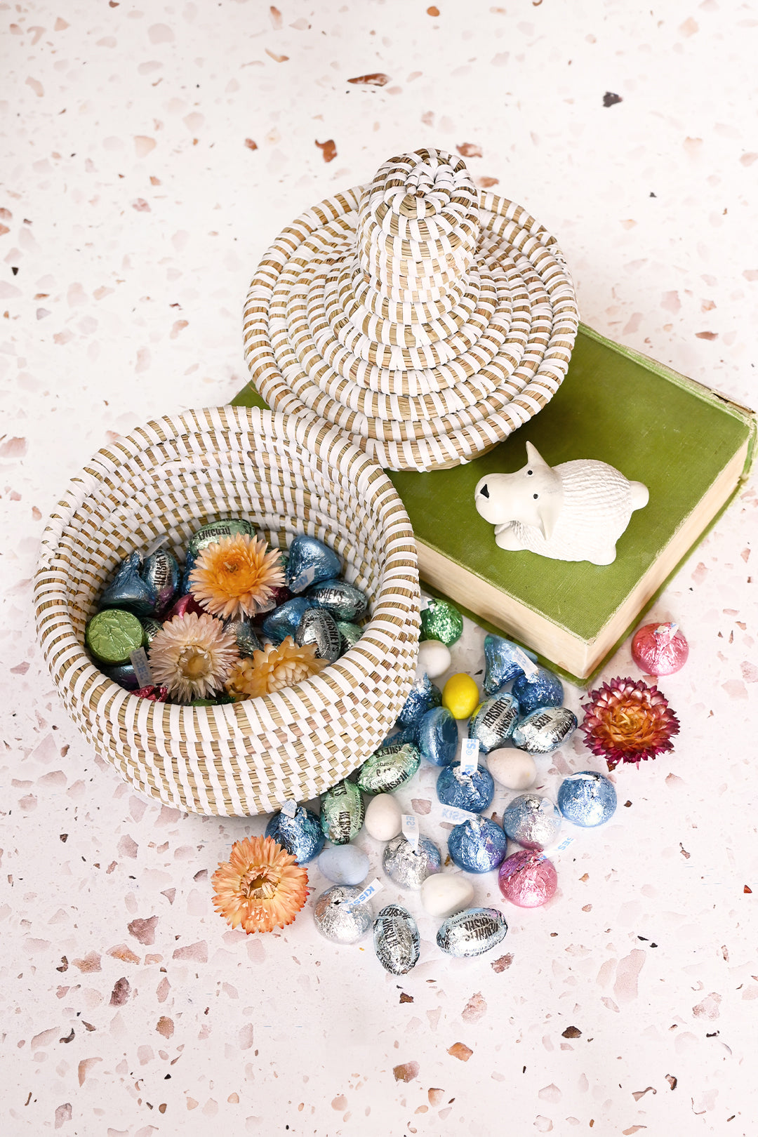 Wolof women living in rural Senegal utilize salvaged strips of plastic and cattail stalks to create vibrant, useful baskets for the home. These scaled-down lidded baskets are a great way to present small gifts and baked goods.