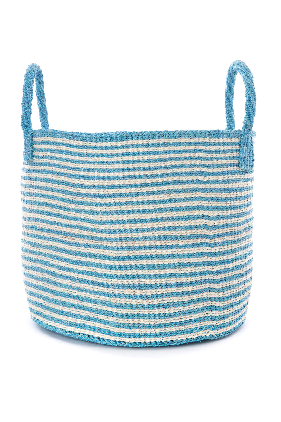 Rural Kamba women living near Kitui, Kenya, hand weave these classic totes from tough sisal fibers, in alternating rows of sky blue and natural white. Sisal grows well in the semi-arid climate of eastern Kenya, and its spiky leaves contain long fibers that can be extracted for weaving. Simple woven sisal handles make this a 100% sustainable accessory.