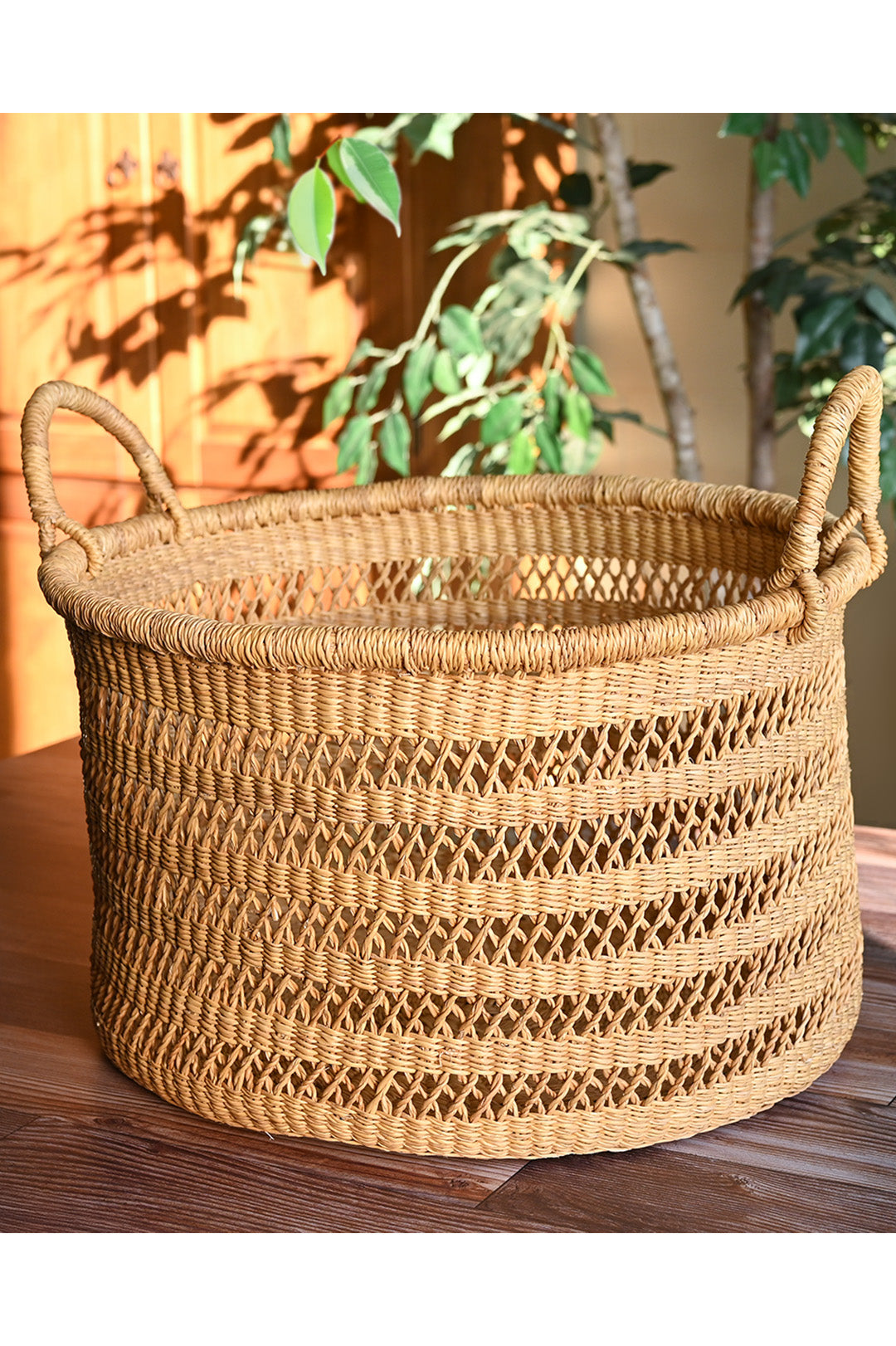 Weavers in Ghana's northern Bolga region excel at weaving the thick stalks of elephant grass that grow there. Weavers use an airy lacework design to create this beautiful storage basket with handles. Bolga baskets can be easily rinsed and reshaped as needed.