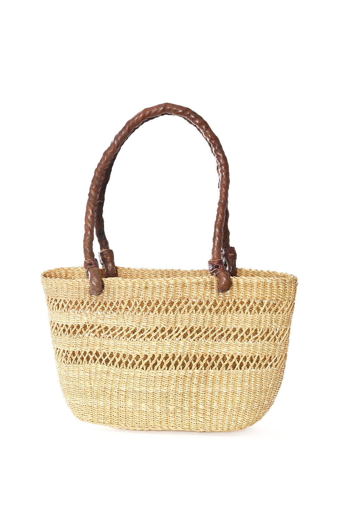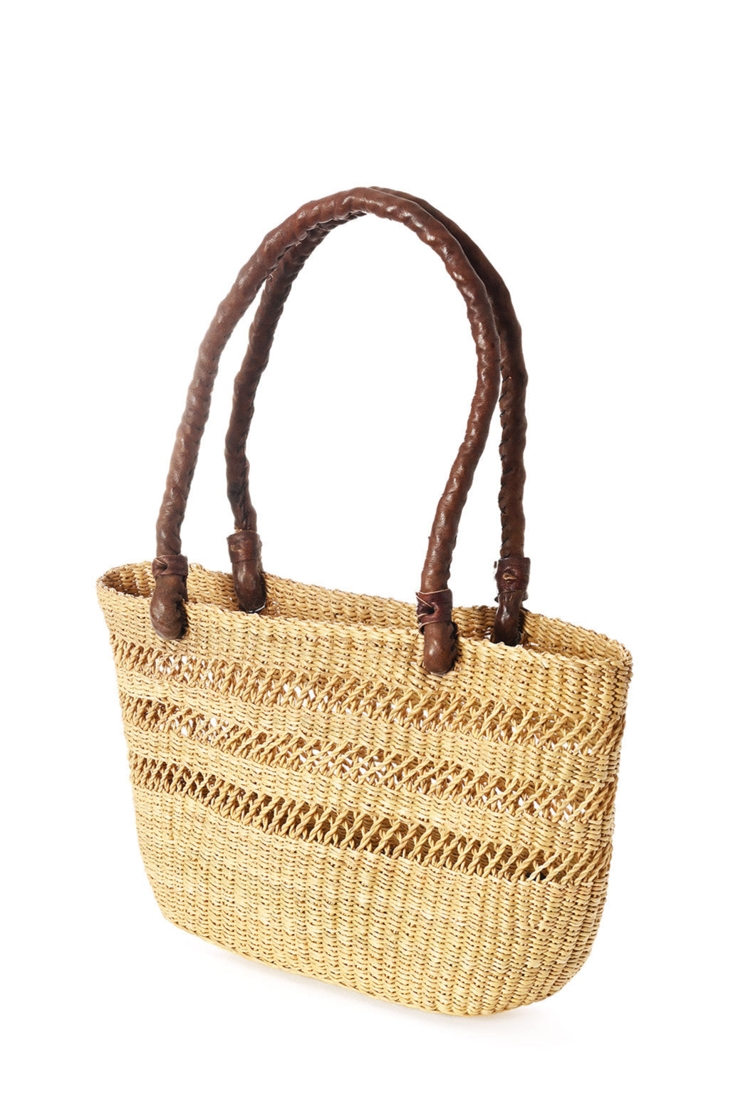 This sweet mini tote is woven from thick, tough elephant grass by artisans in the Bolgatanga region of Ghana. The natural grass is decorated with an open and airy lace weave. The tote has an open top and is finished with a brown leather-wrapped handle. Bolga baskets can be easily rinsed and reshaped as needed.