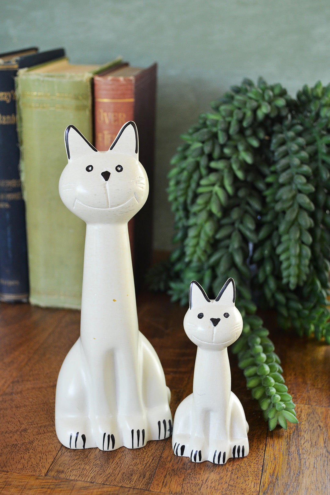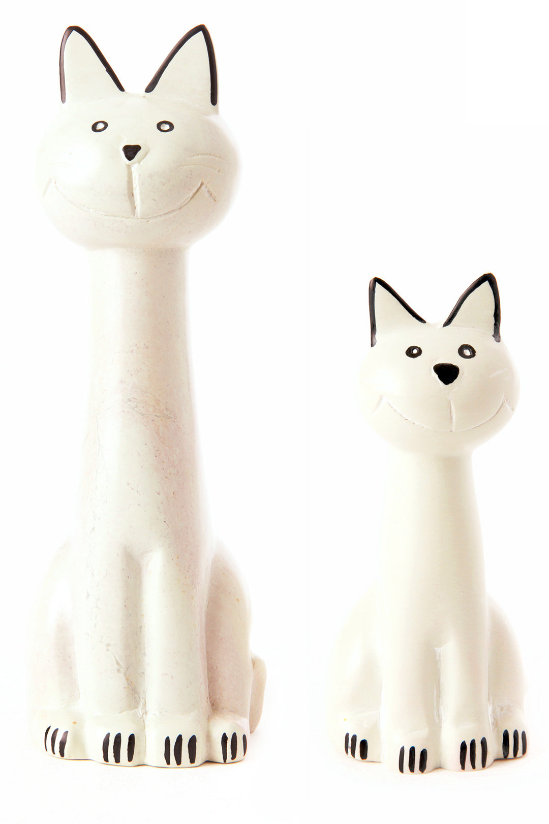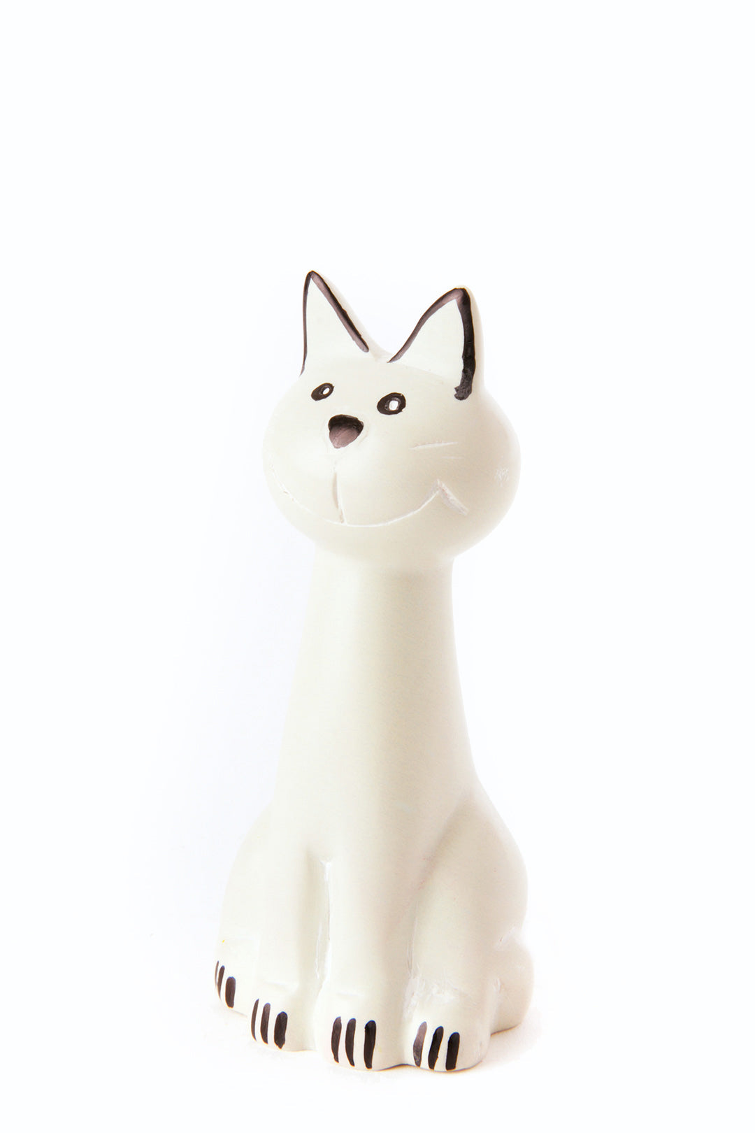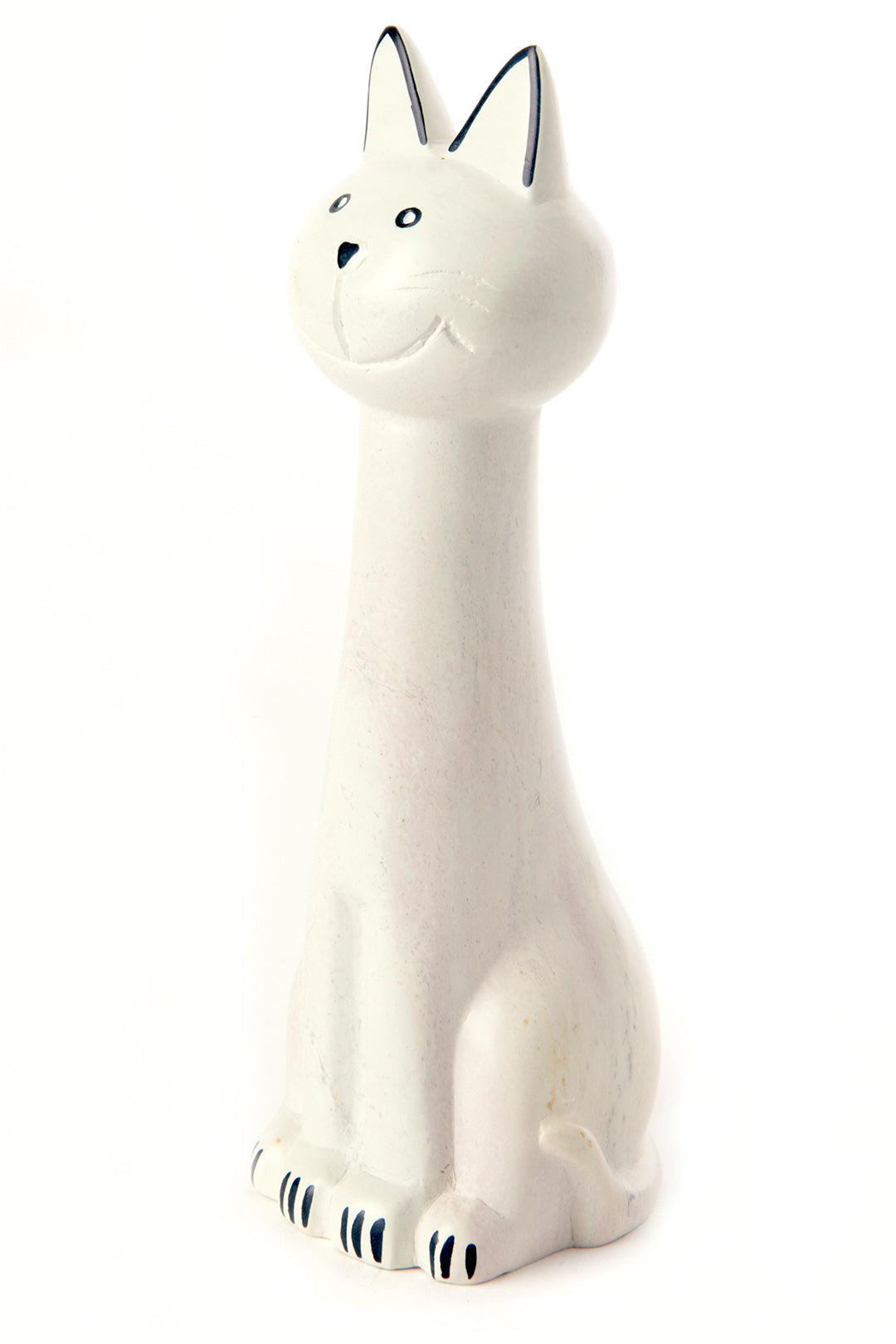 Kenyan artisans hand carve these cheerful cats from soft natural soapstone. Using just a touch of non-toxic black dye to accent, each sculpture shows the natural creamy coloration of soapstone. A fun addition to any room of the home, this sweet handmade decor accessory makes a wonderful gift, particularly for cat owners.
