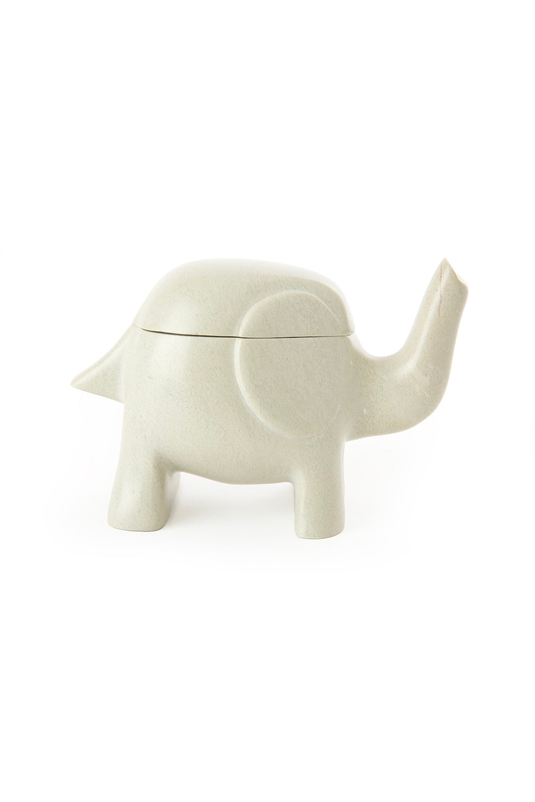 Kenyan artisans hand carve this fun elephant box from creamy white soapstone. Since soapstone can contain small veins of color from various minerals, each treasure box is completely one-of-a-kind.
