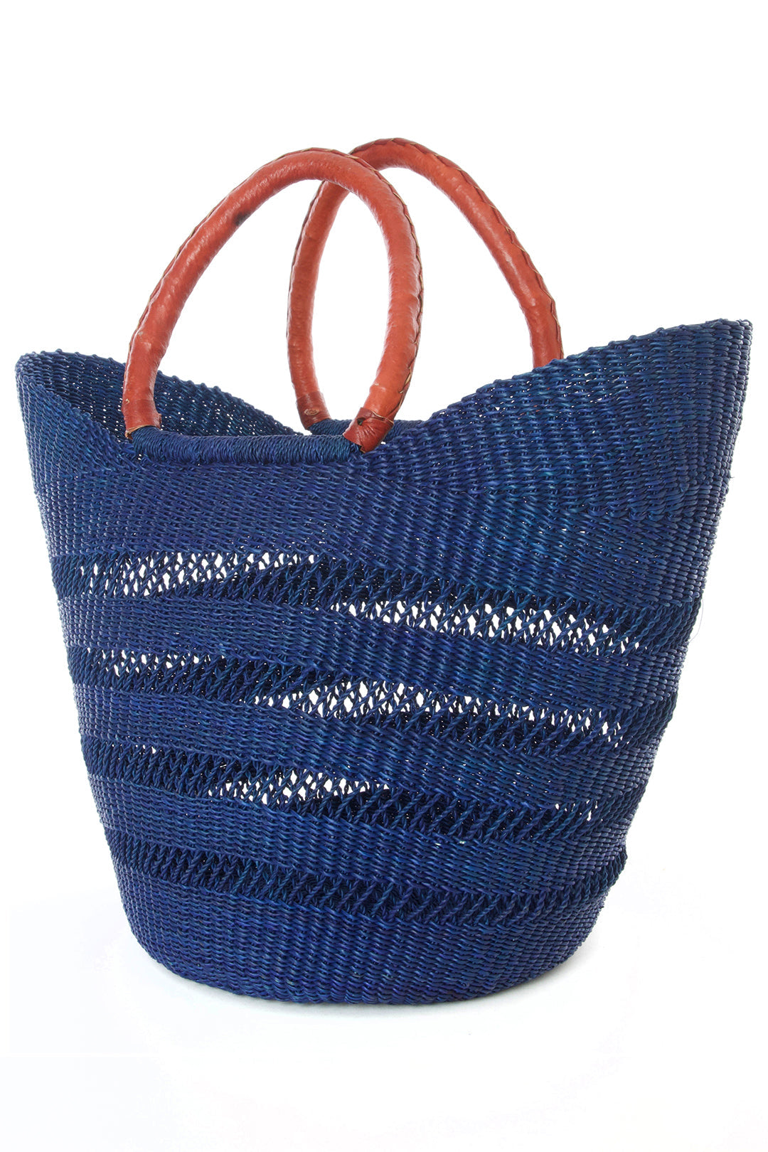 Artisans in the Bolgatanga region of Ghana weave beautiful shopper baskets from thick, tough elephant grass. An intricate lacework design adds visual interest and delicacy to this durable handmade accessory, and leather wrapped handles are comfortable to carry.