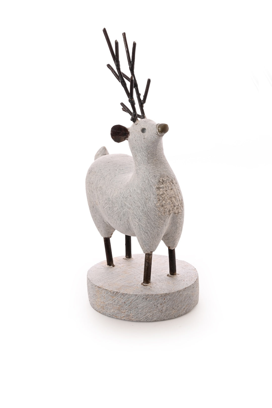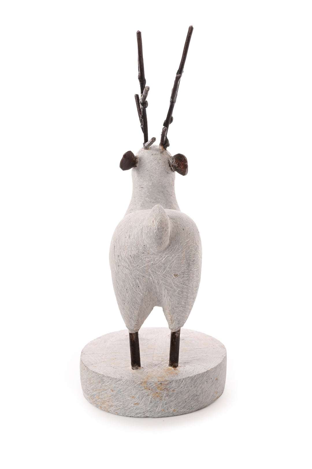 Zimbabwean artist Luke Jimu combines textured pale serpentine stone and recycled metal into delightful reindeer sculptures. With the antlers made from metal, each stone reindeer is affixed to a base for stability.