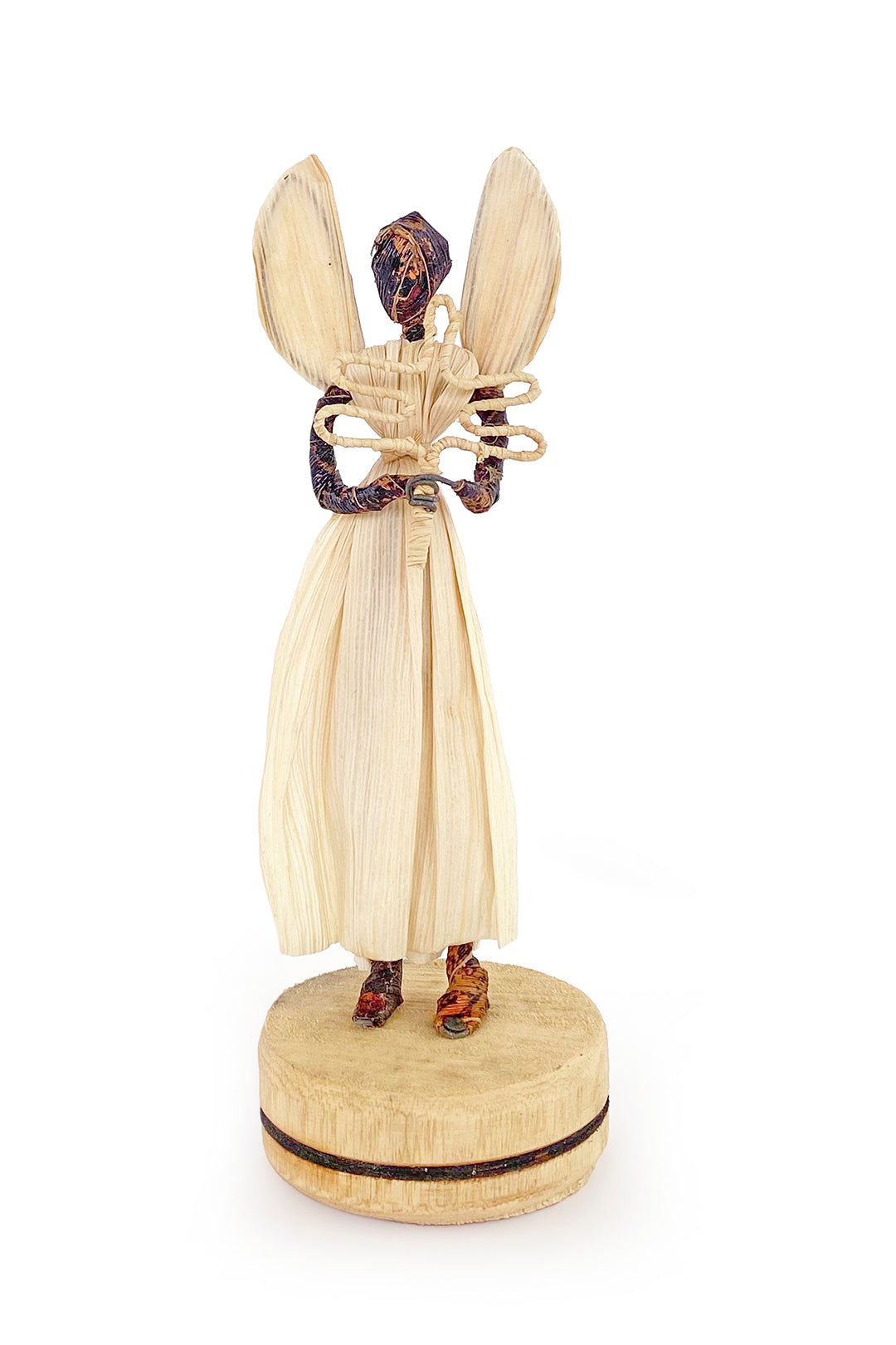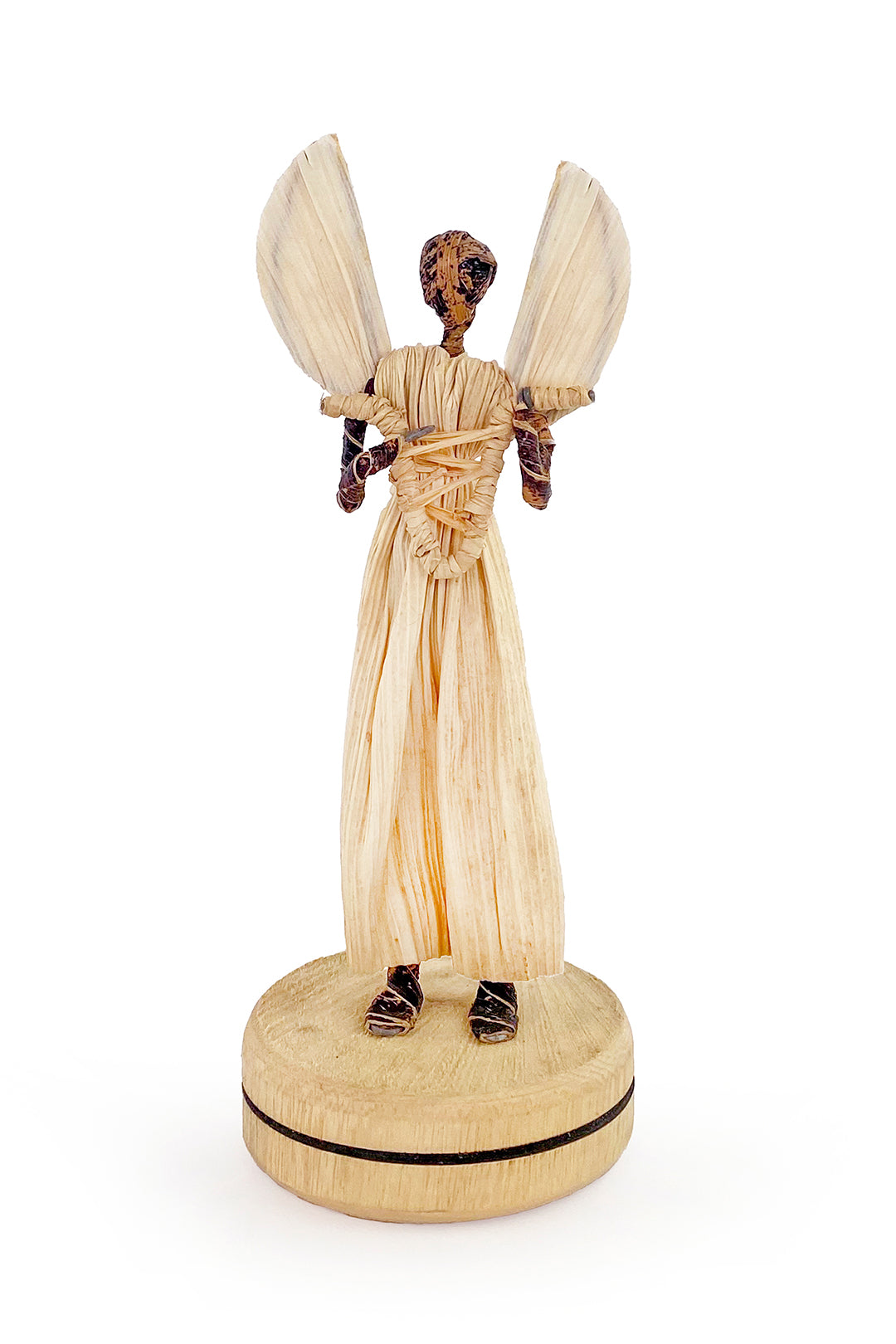 This peaceful angel is displayed holding a star atop a wooden base. Using natural materials like banana fiber and raffia allows artisans to earn income with no stress on their environment, and the rustic nature of these handcrafted ornaments adds a distinctive natural touch to holiday decor. Angels will come with assorted items in hand or clasped in prayer.