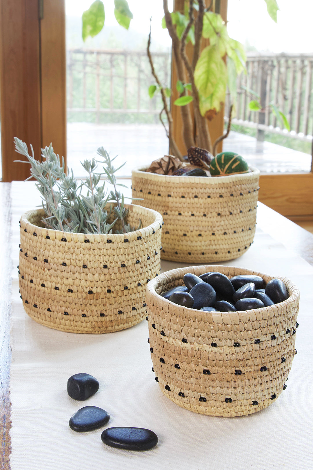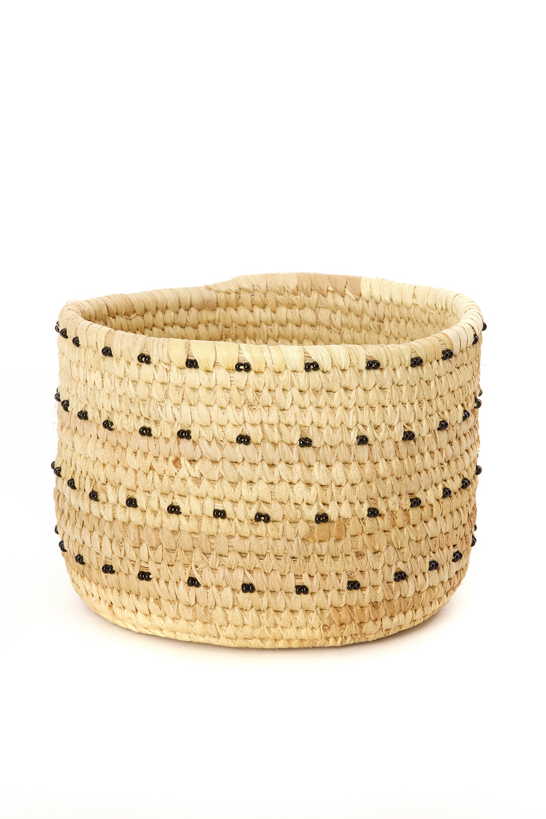 Nomadic baskets are sold in two useful nesting sizes and are adorned with beaded pattern of black dots. Sold singly. Because this is a handcrafted item, size and shape may vary.