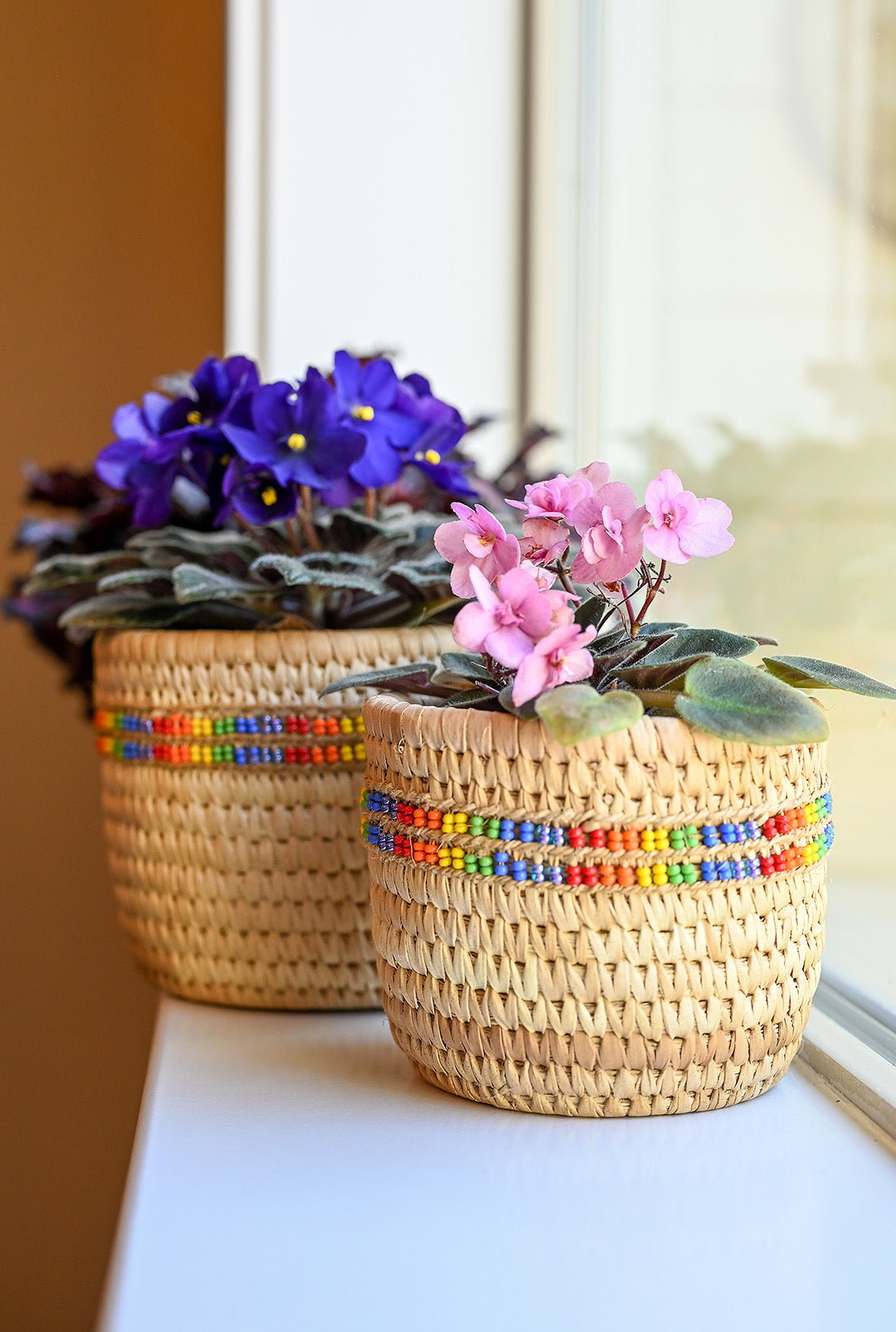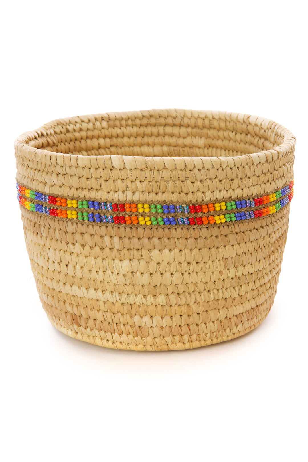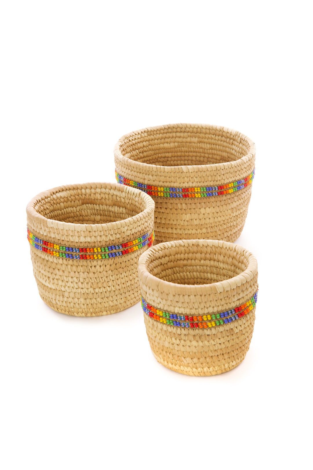 Nomadic baskets are sold in three useful nesting sizes and are adorned with a band of multicolor beads. Because these baskets are handcrafted, size and shape may vary.